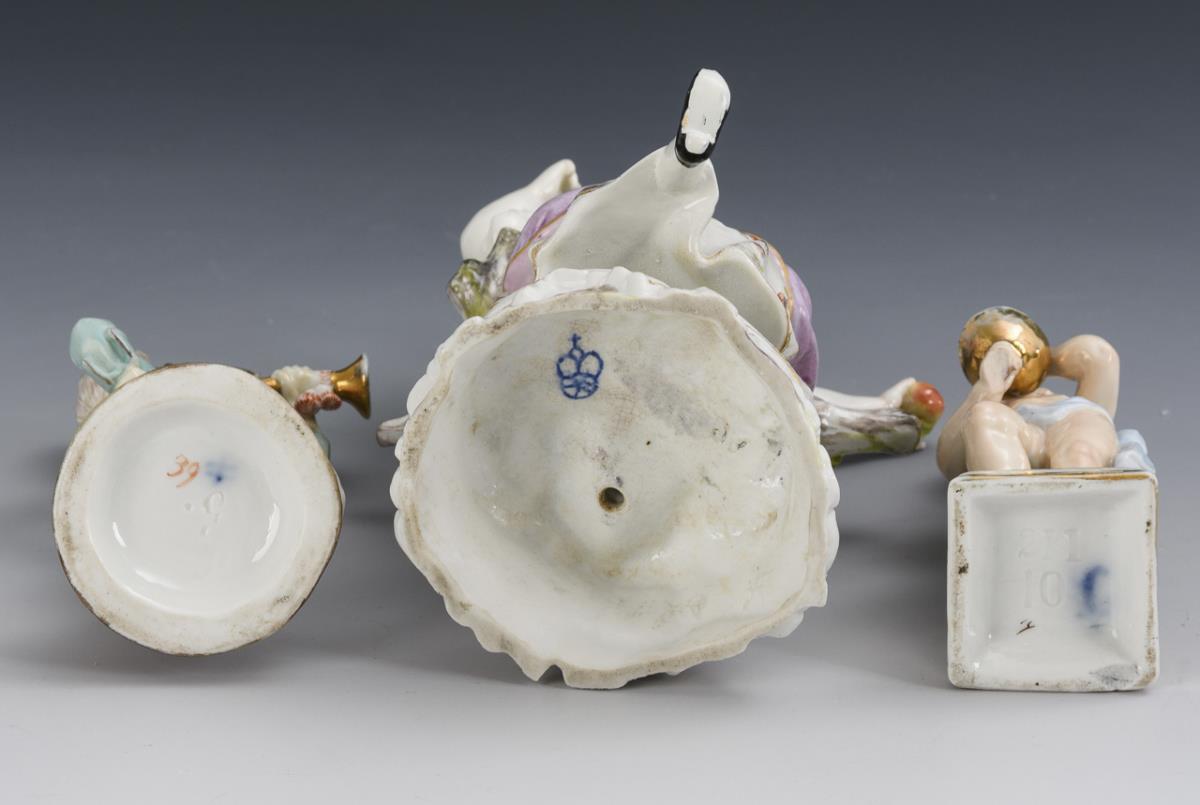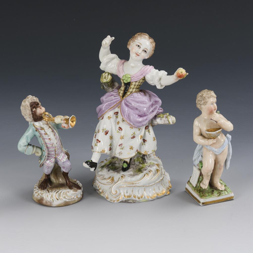 1x imitierte Höchstmarke: tanzendes Mädchen mit Apfel (H 15 cm). / 1x Sitzendorf: Affenmusiker mit Trompete (H 10,5 cm). / 1x Jean Petit: Sternzeichenfigur "Skorpion" (H 10,5 cm). Rechter Arm und 1 Bein des Mädchens restauriert, Teil der Trompete am Affenmusiker geklebt, Weintraube der Sternzeichenfigur bestoßen.