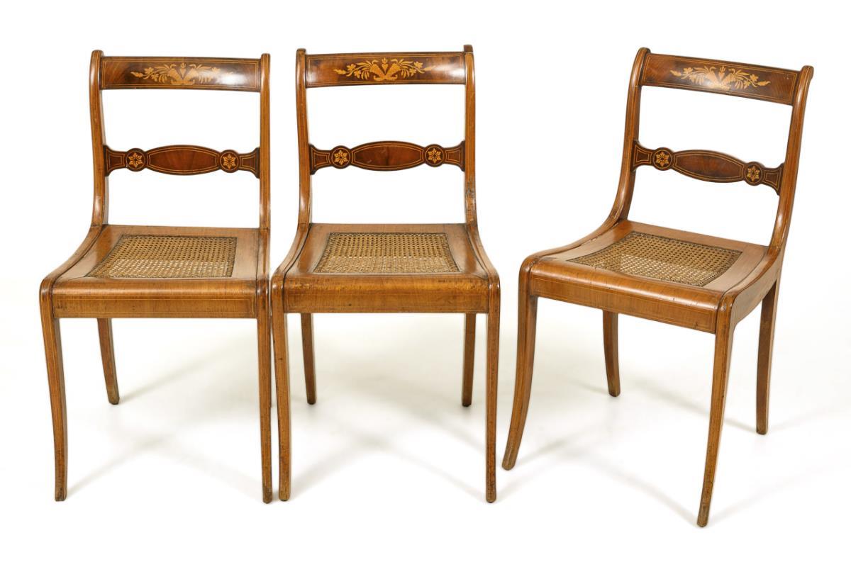 3 Lehnstühle mit Sitzfläche aus Korbgeflecht, Rückenlehne mit geradem Schulterbrett und geschwungenem Mittelbrett, dekoriert mit Fadenintarsien und Füllhorn-Marketerie. Alters-/Gebrauchsspuren, teils restaurierungsbedürftig.