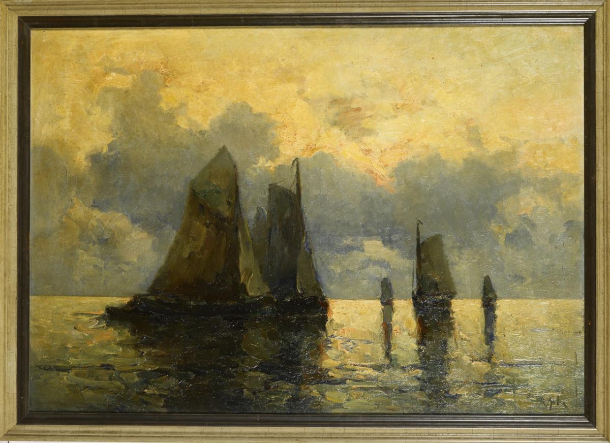 Mehrere Segler auf dem ruhigen Ozean am Abend. Leichte Altersspuren.