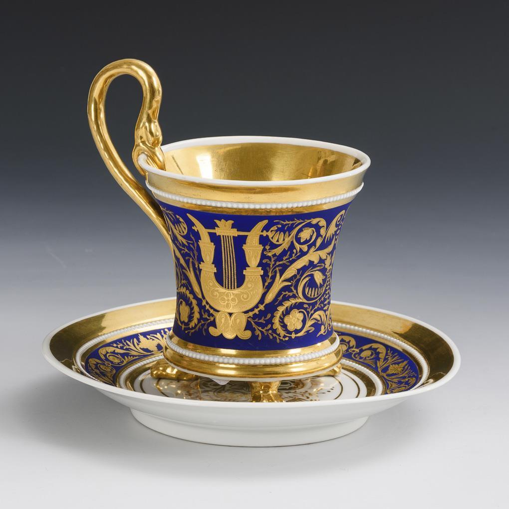 Kratertasse mit drei Tatzenfüßen, Perlbändern und Schwanenhenkel. Mattblauer Fond mit goldradiertem Ornamentmuster, reich goldstaffiert. Minimaler Goldabrieb im Untertassenspiegel und an den Tatzenfüßen.