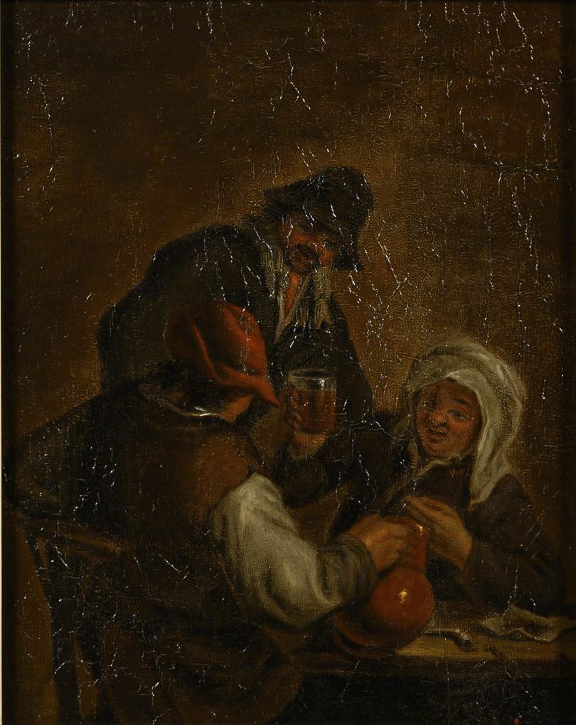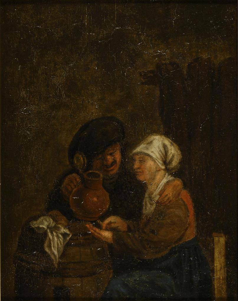Drei Trinkende an einem Tisch beim Anstoßen sowie Paar am Fass mit einem Krug. Altersspuren.