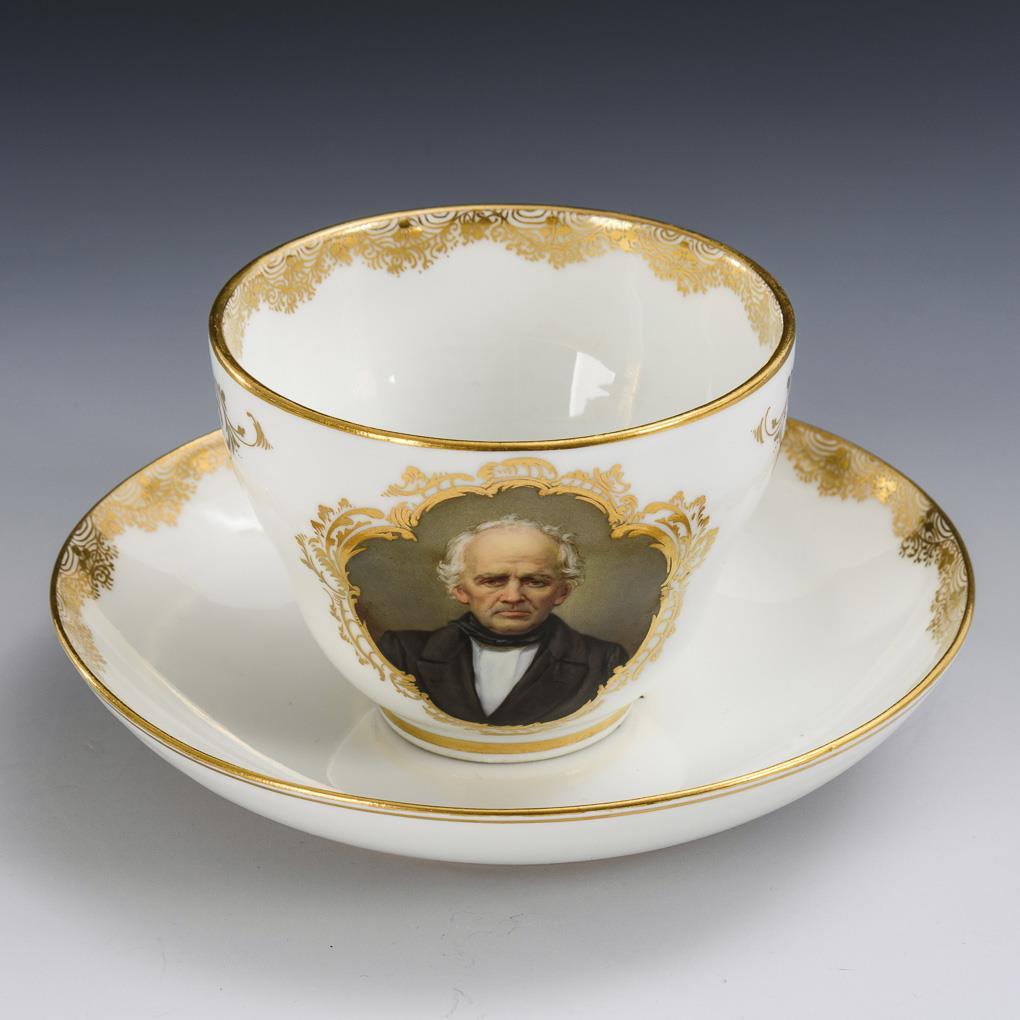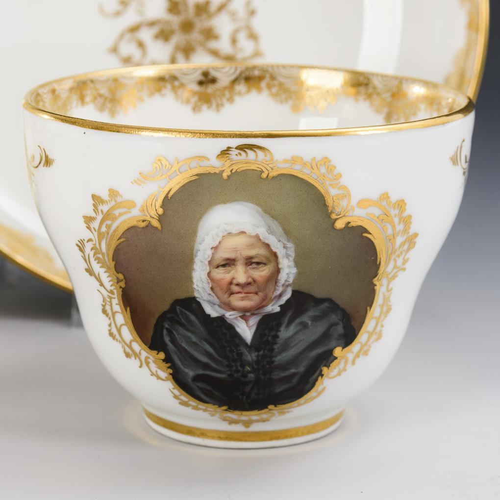 Glockentassen mit dem schauseitigen Bildnis einer alten Frau bzw. eines alten Herren in einer goldrocaillegerahmten Vierpasskartusche.