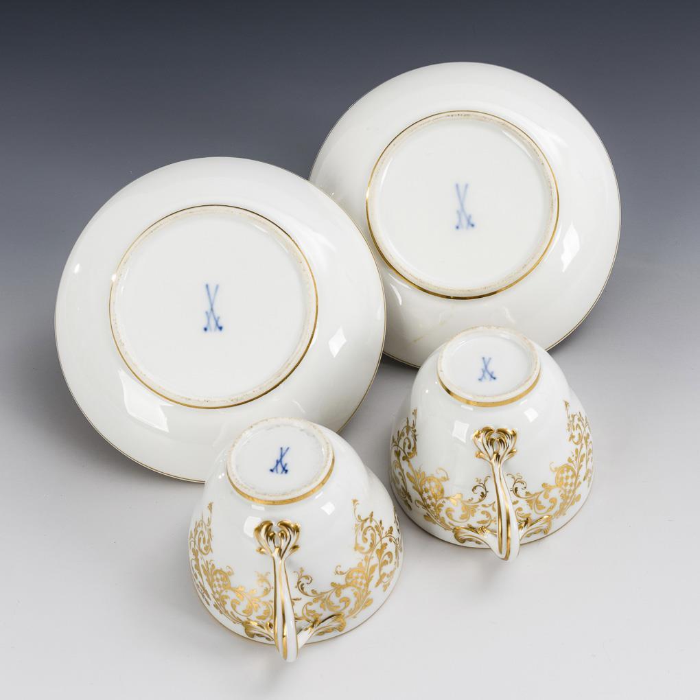 Polychrom bemalt, goldstaffiert. 2 Tassen (H 7 cm), 2 originale Untertassen (Ø 15 cm).
