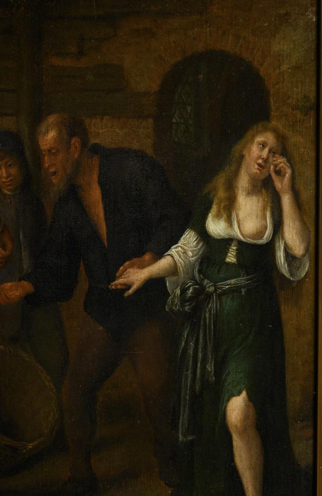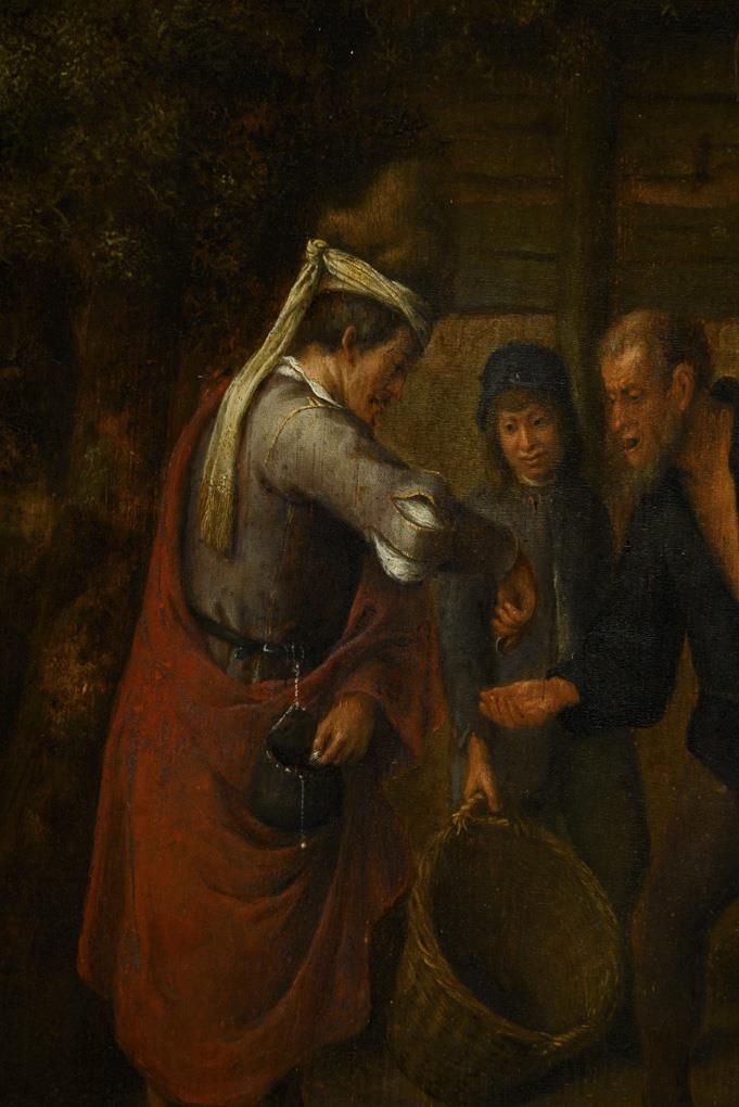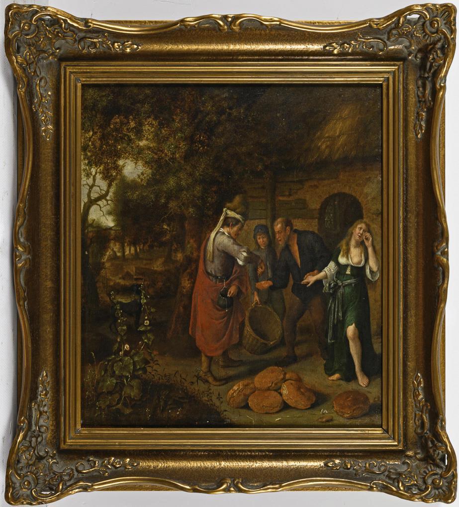 Bauer vor dem Haus beim Handeln mit einem Edelmann um die Tochter. Leichte Altersspuren.