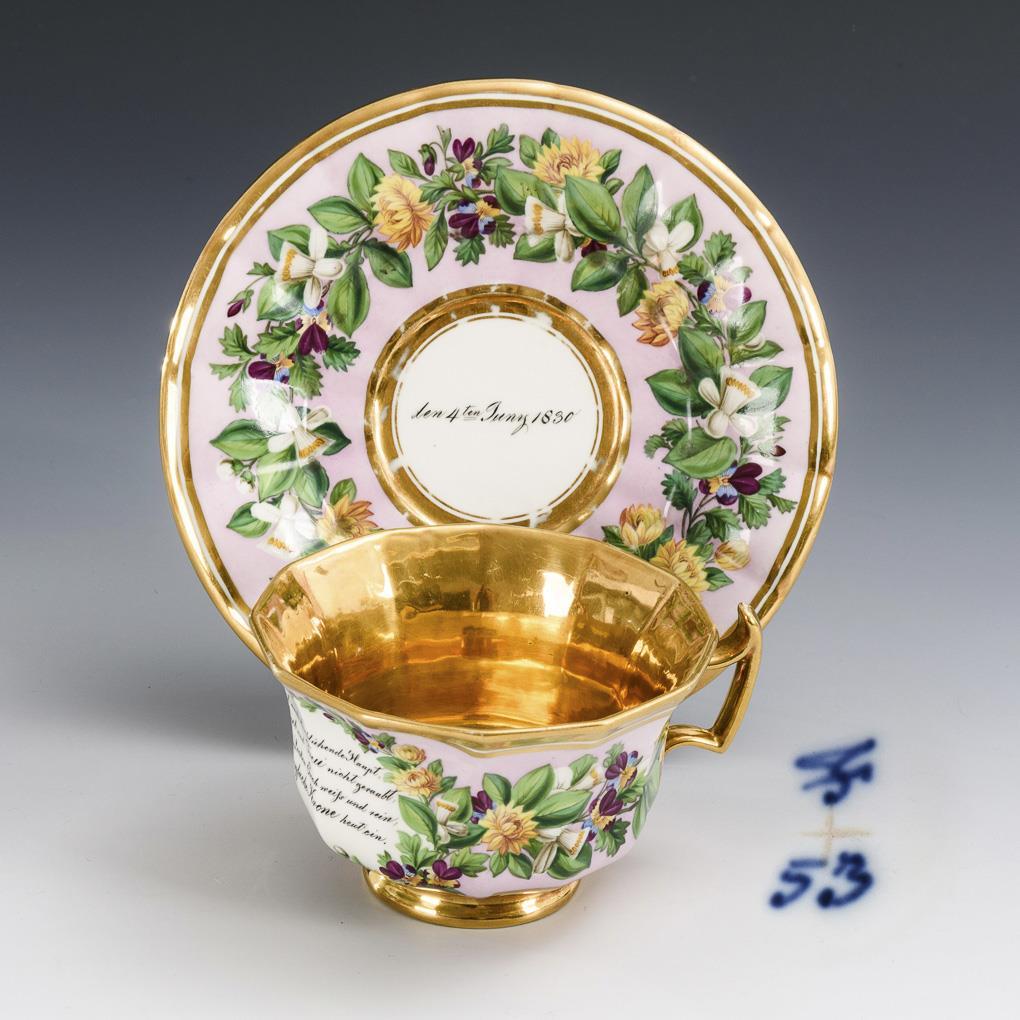 Gefußte, polygonale Glockentasse mit spitz geschweiftem Henkel. Zwischen goldenen Fondbändern rosa Fond mit einem umlaufenden Blumenband, schauseitig der Vers "Beugte die Zeit auch das blühende Haupt, / Hat sie doch Lieb und Treu nicht geraubt. / Schlingt in die Locken Euch weiß und rein, / Dafür die dreyfache Krone heut' ein.", Innenvergoldung. Im Spiegel der Untertasse die Datierung "den 4ten Juny 1830". Minimaler Goldabrieb im Untertassenspiegel.