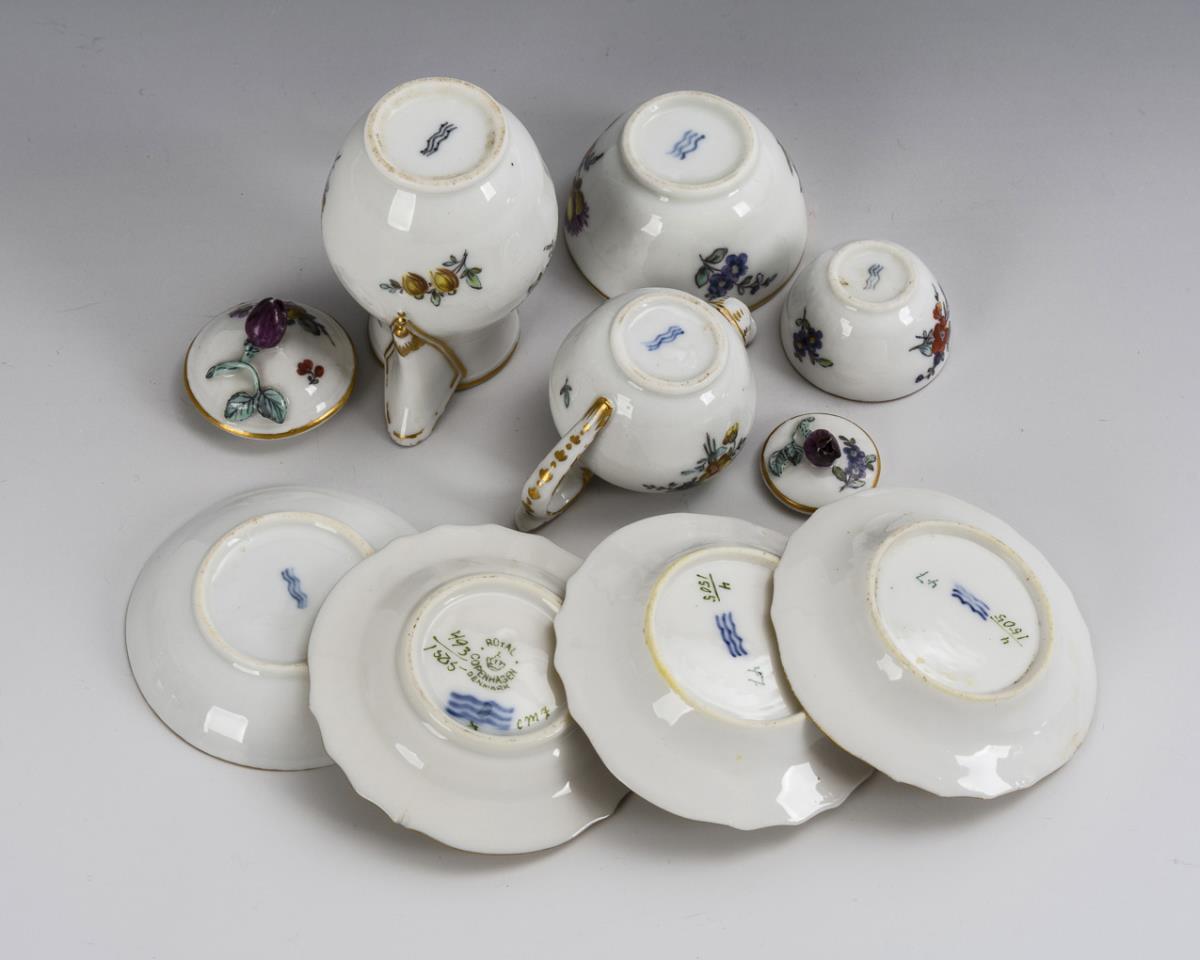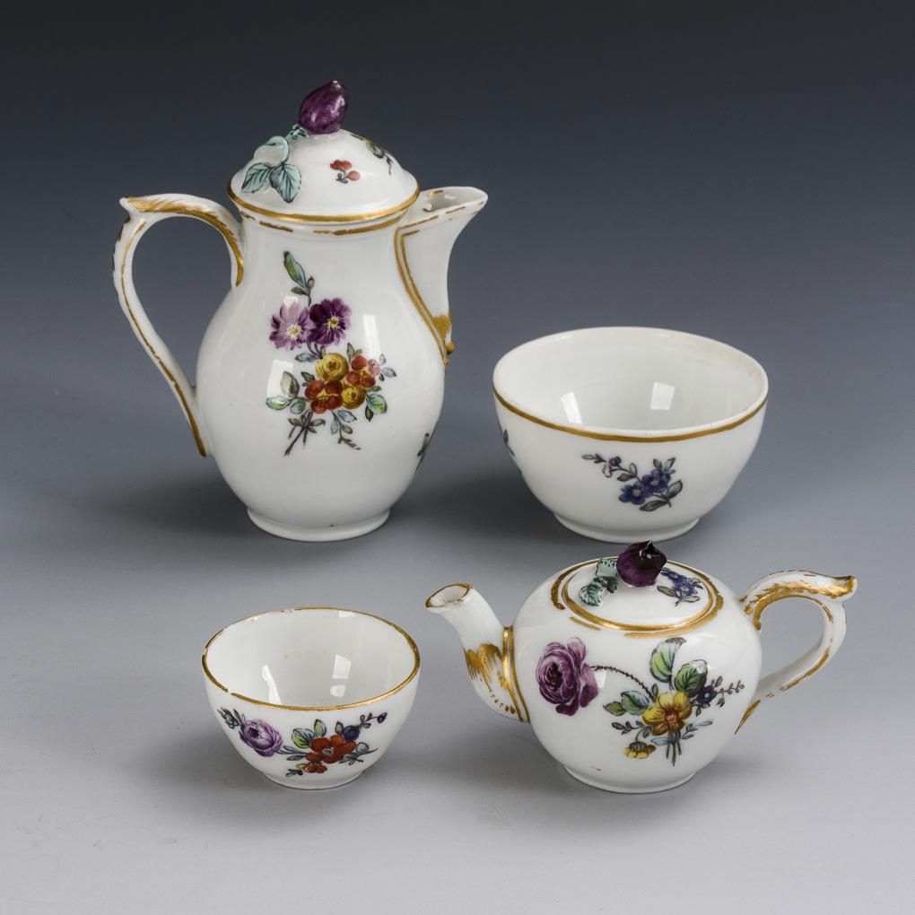 8 Teile. Kaffeekanne (H 9 cm), Teekanne (H 4,5 cm), Kumme (Ø 5,5 cm), Schale (Ø 3,8 cm) und 3+1 Teller (Ø ca. 7 cm). 3 Tellerränder und 1 Schalenrand mit Randbestoßung, beide Deckelknäufe bestoßen.