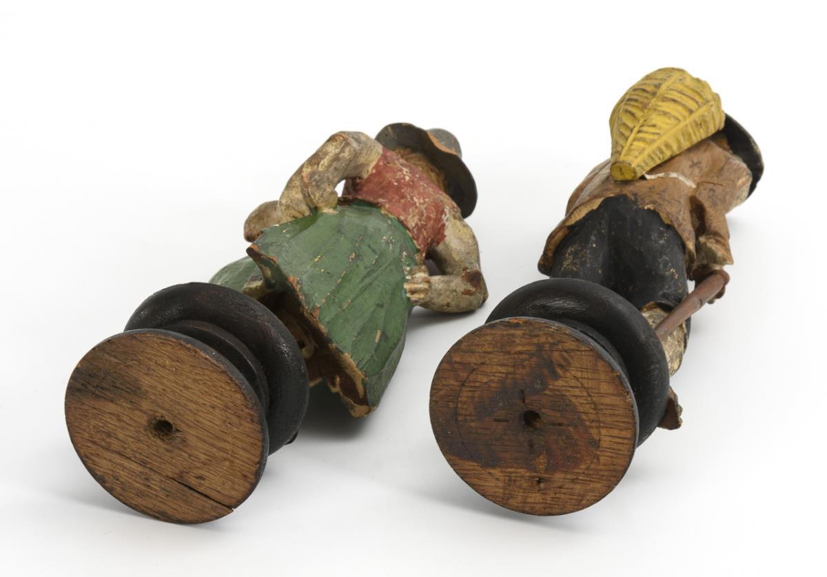 Vollplastisch geschnitztes Volkskunst-Bauernpaar. Er mit Kiepe und sie mit einem Huhn unter dem Arm. Einige Bruch-/Klebestellen, geringe Ausbesserungen, wenige Fehlstellen.
