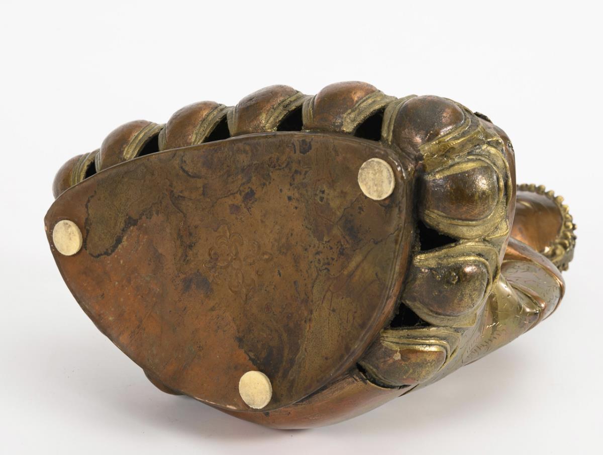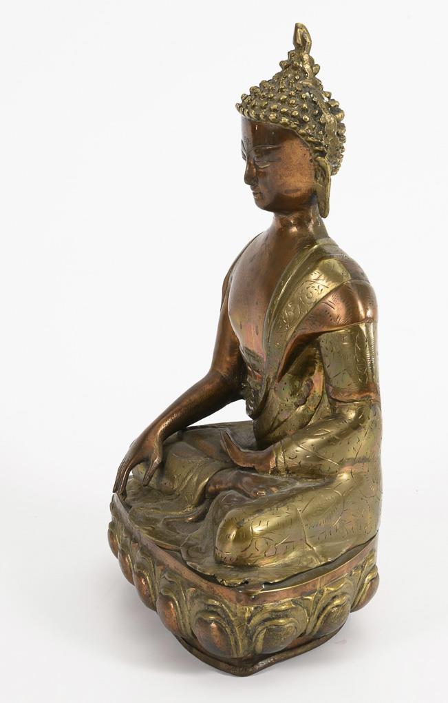 Sitzende Figur auf Lotossockel mit der Geste der Erdberührung. Korpus und Gewand mit messing- und bronzefarbenen Überzügen. Sockel durchbrochen gearbeitet, verschlossener Boden.