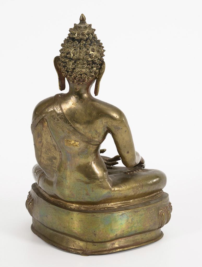 Auf Lotossockel sitzende Figur mit dem Zeichen der Erdberührung. Auf der Bekleidung Schriftzeichen für 'Langes Leben'.