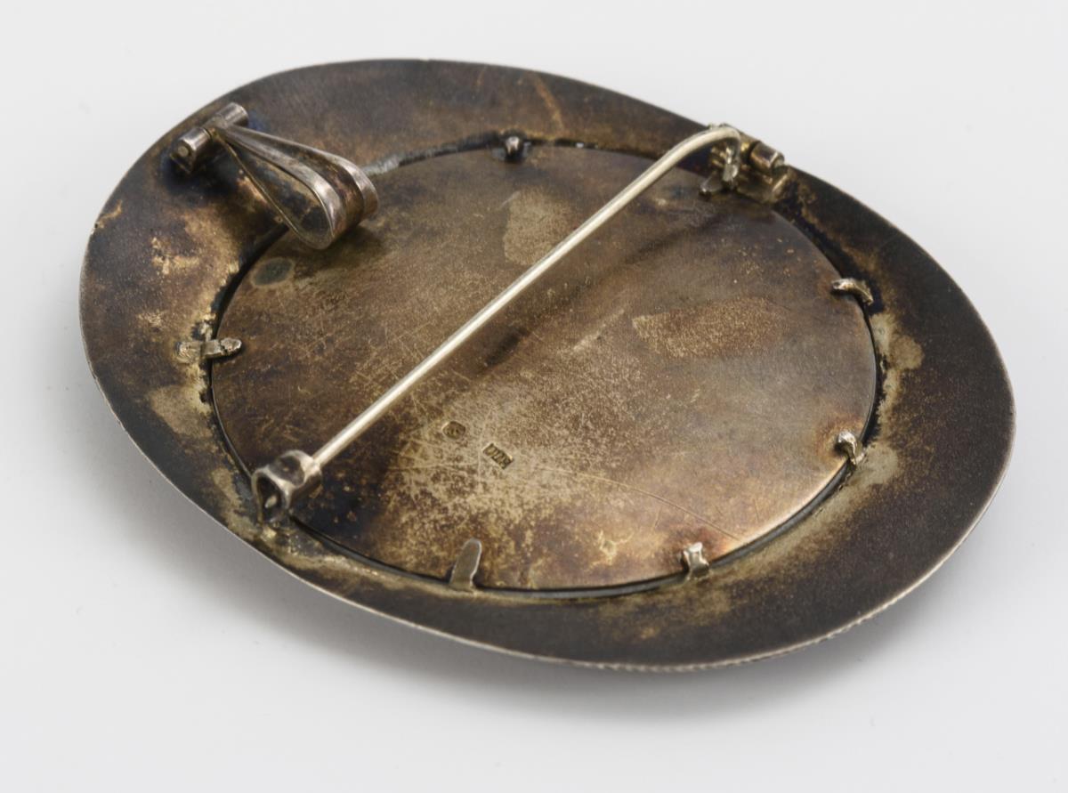 Emailmalerei wohl auf Milchglas oder Porzellan, Silber. 6,5 x 5 cm. 24 g.