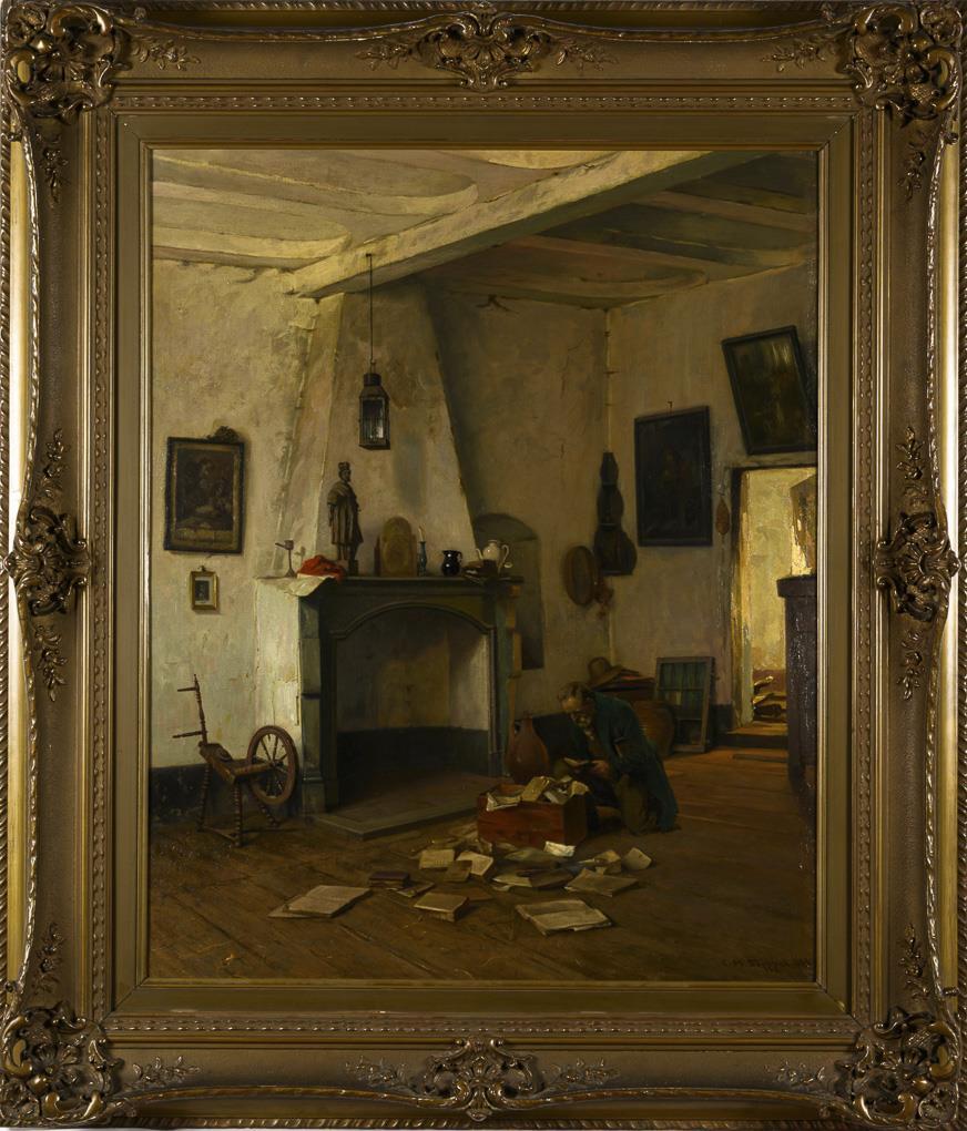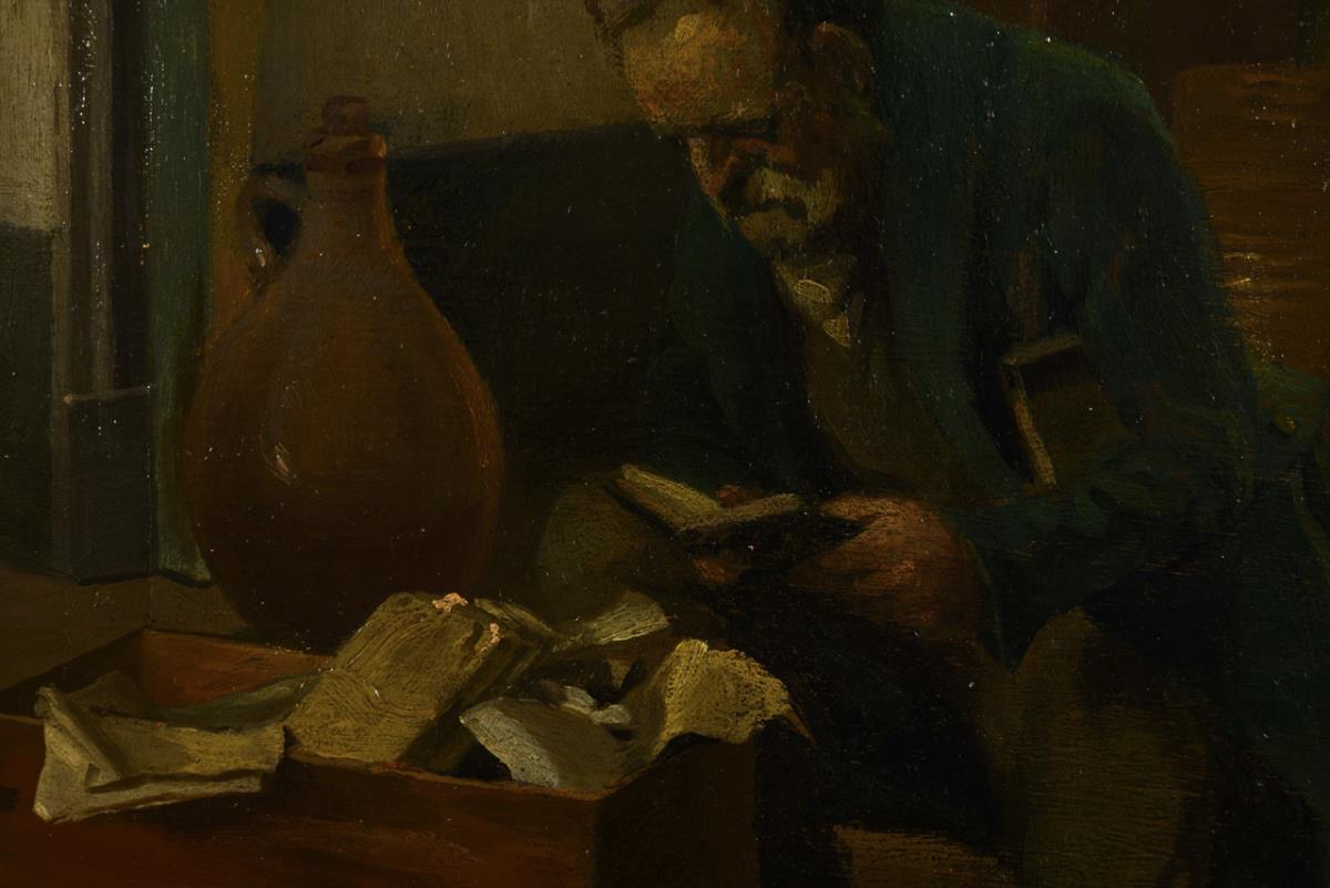 Alter Mann beim Durchwühlen einer Bücherkiste in einem alten Zimmer mit Kamin, dessen Wände noch mit religiösen Gemälden geschmückt sind.