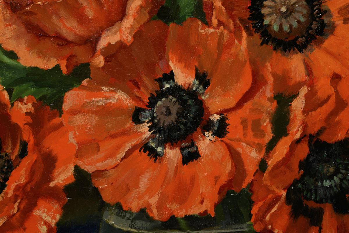Großer Mohnstrauß mit leuchtend roten Blüten in einer Glasvase.