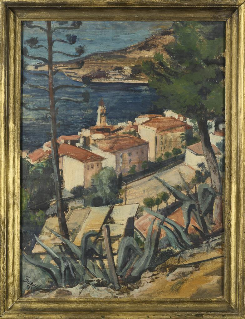 Blick über die Agaven und die Häuser oberhalb des Meeres. Leichte Altersspuren.