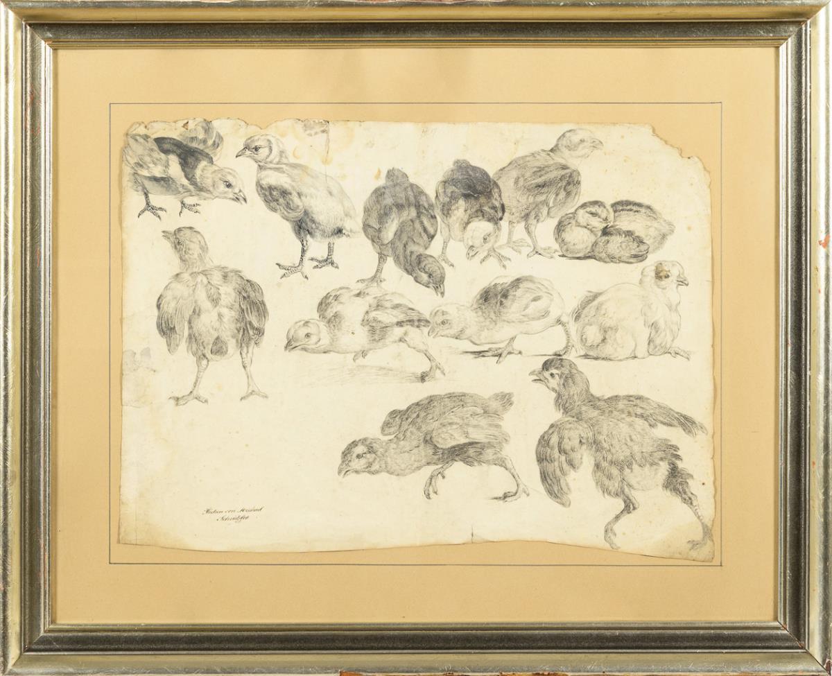 Bewegungsstudie von Jungvögeln, mit sepiafarbener Tusche beschriftet "Studien von Michael Schnitzler". Blatt mit kleinen Rissen, knickspurig, etwas fleckig und stockfleckig.
