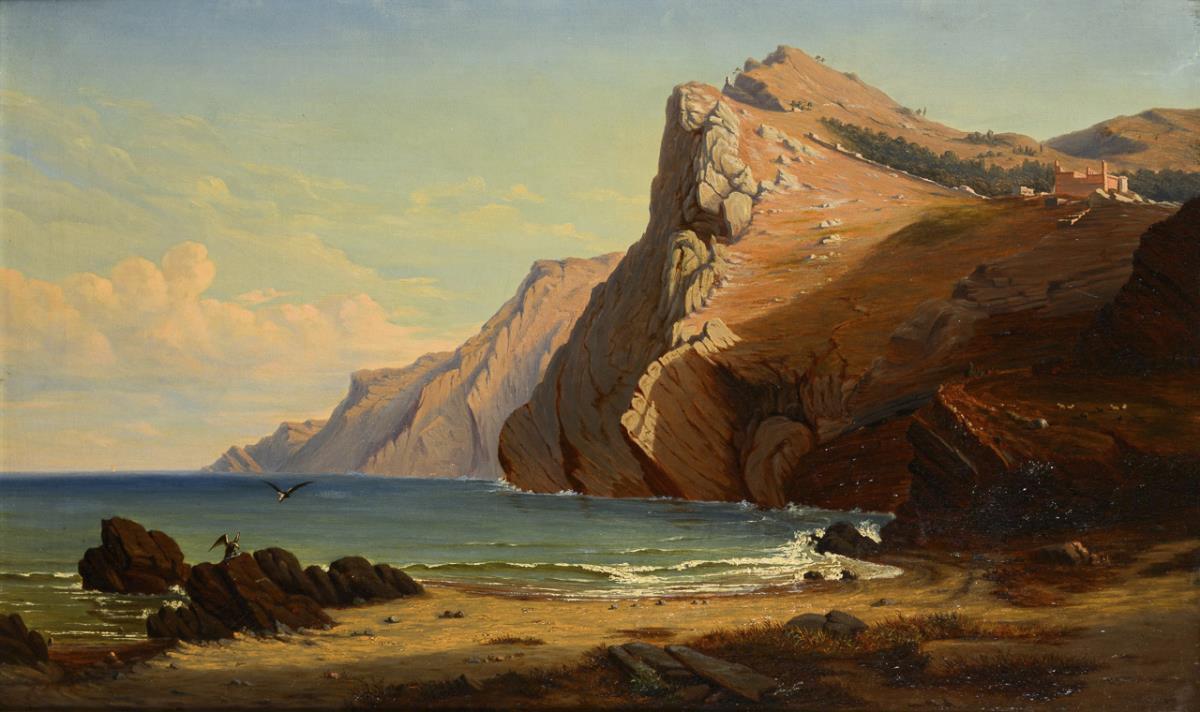 Flache Brandung an felsiger Küste mit einem Gebäude auf dem Berghang im warmen Sonnenschein. Leichte Altersspuren.