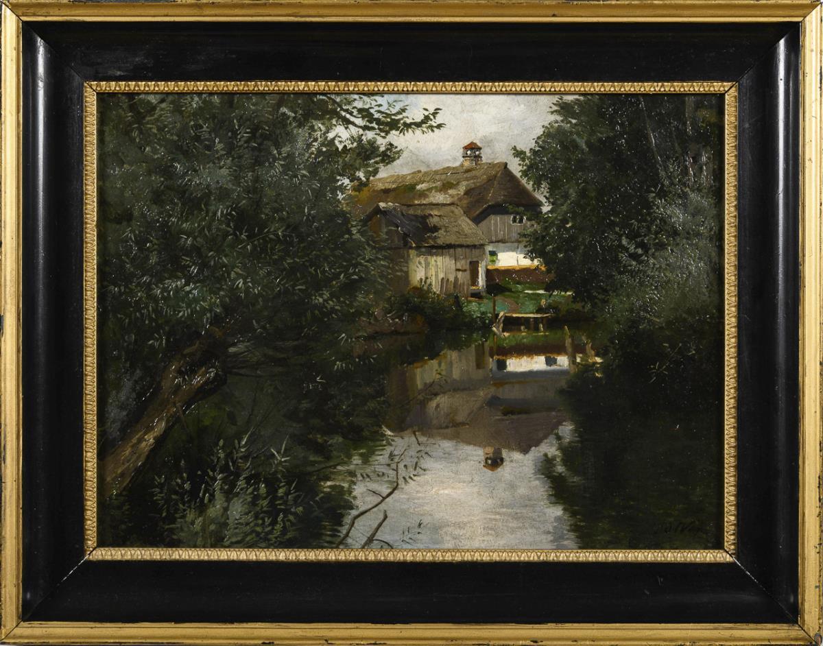 Gemächlich dahinfließendes Gewässer mit dicht bewachsenen Ufern nahe einer Wassermühle im Sonnenschein. Minimale Altersspuren.