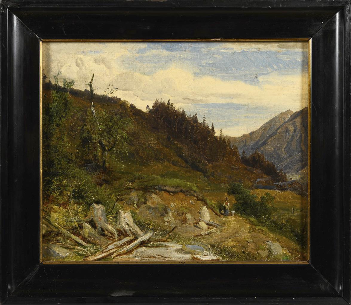 Berghang mit Baumstümpfen und Tannen sowie Staffagefiguren auf einem Weg unter wolkigem Himmel. Leichte Altersspuren.