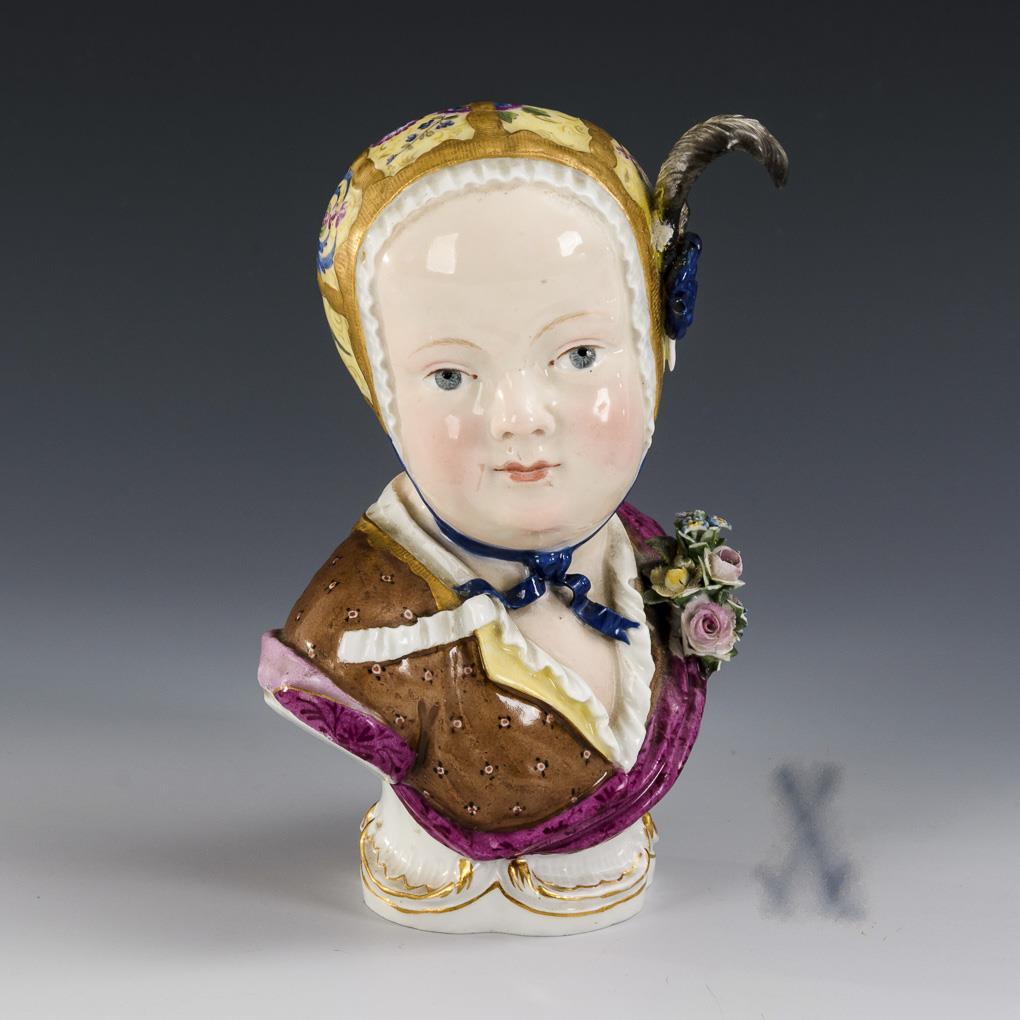 Büste eines Knaben in barocker Kinderkleidung. Feder geklebt, Blüten und Blätter bestoßen.