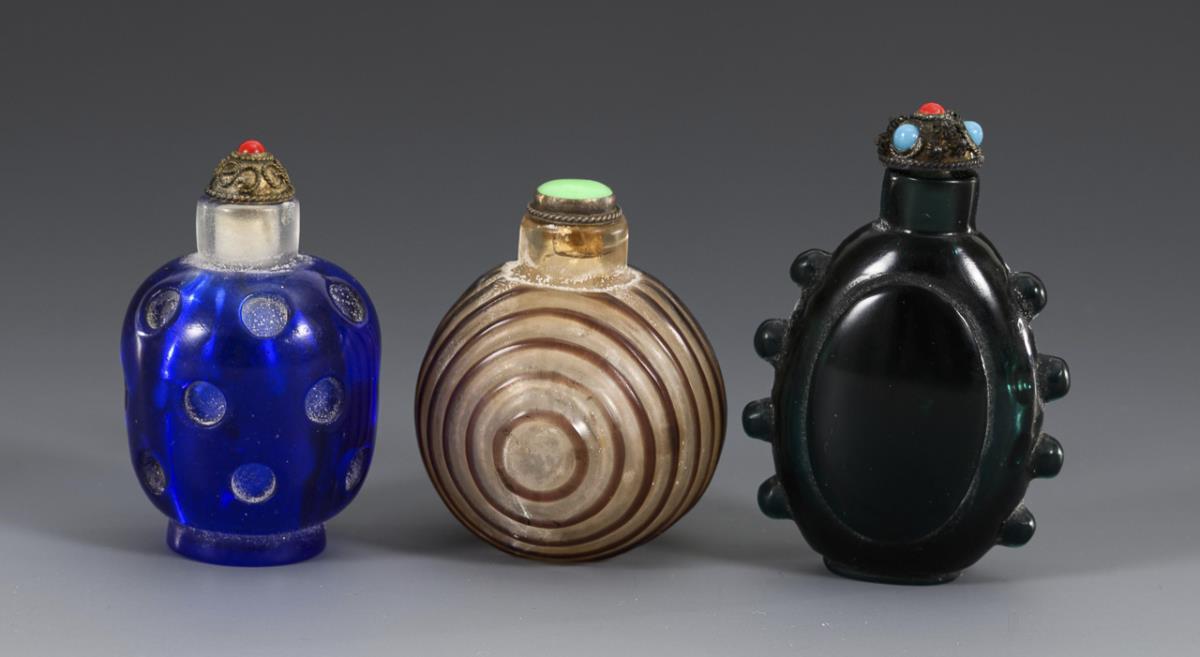 Dunkelgrüne Glasflasche mit seitlichen Noppen. / Flasche mit blauem Überfang und kreisförmigen Aussparungen. / Kugelform mit ringförmigen, violetten Fadenauflagen. Alle mit Stöpsel, zwei mit Lanzette.