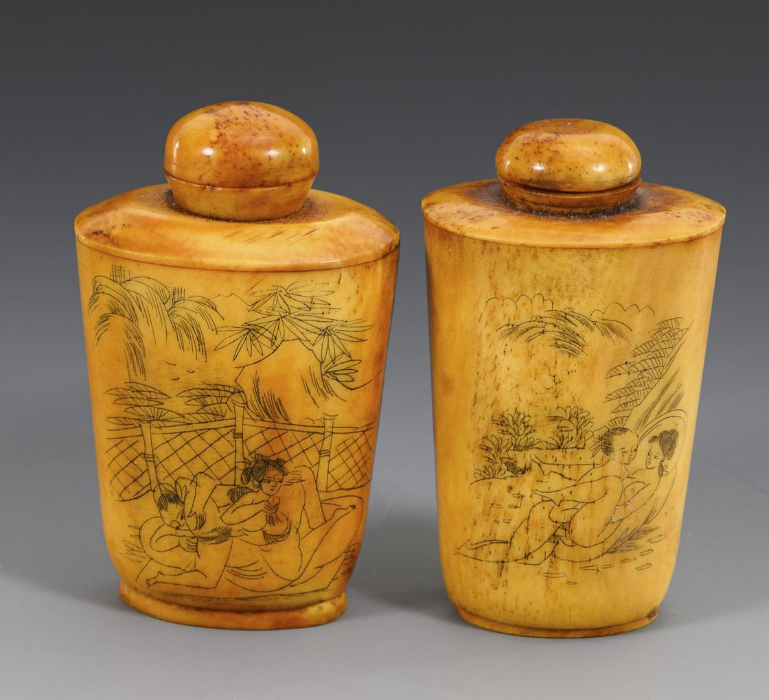 Konische Formen aus bräunlichem Bein, mit gravierten Darstellungen. Passende Stöpsel, einer mit Lanzette.