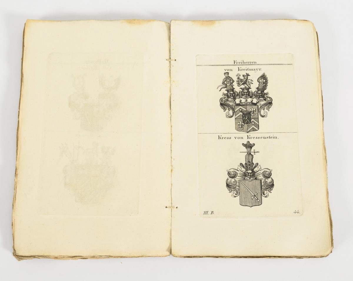 "Aus der Adelsmatrikel gezogen". 100 Kupferstichblätter mit je zwei Wappendarstellungen. Broschurausgabe mit einfacher Fadenheftung. Block locker, Kanten bestoßen.