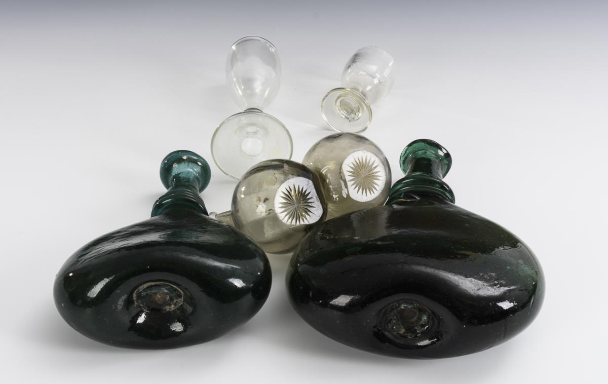 2 Plattflaschen aus dunkelgrünem, blasigem Glas; mit Abriss (H 20,5 und 23,5 cm). / 2 Kelchgläser aus farblosem Glas (H 8,5 und 16 cm). / 1 Essig- und Ölmenage aus rauchfarbenem Glas (H 8 cm). 1 Flasche mit unsicherem Stand, 1 Flasche steht nicht, Henkel der Menage fehlt.