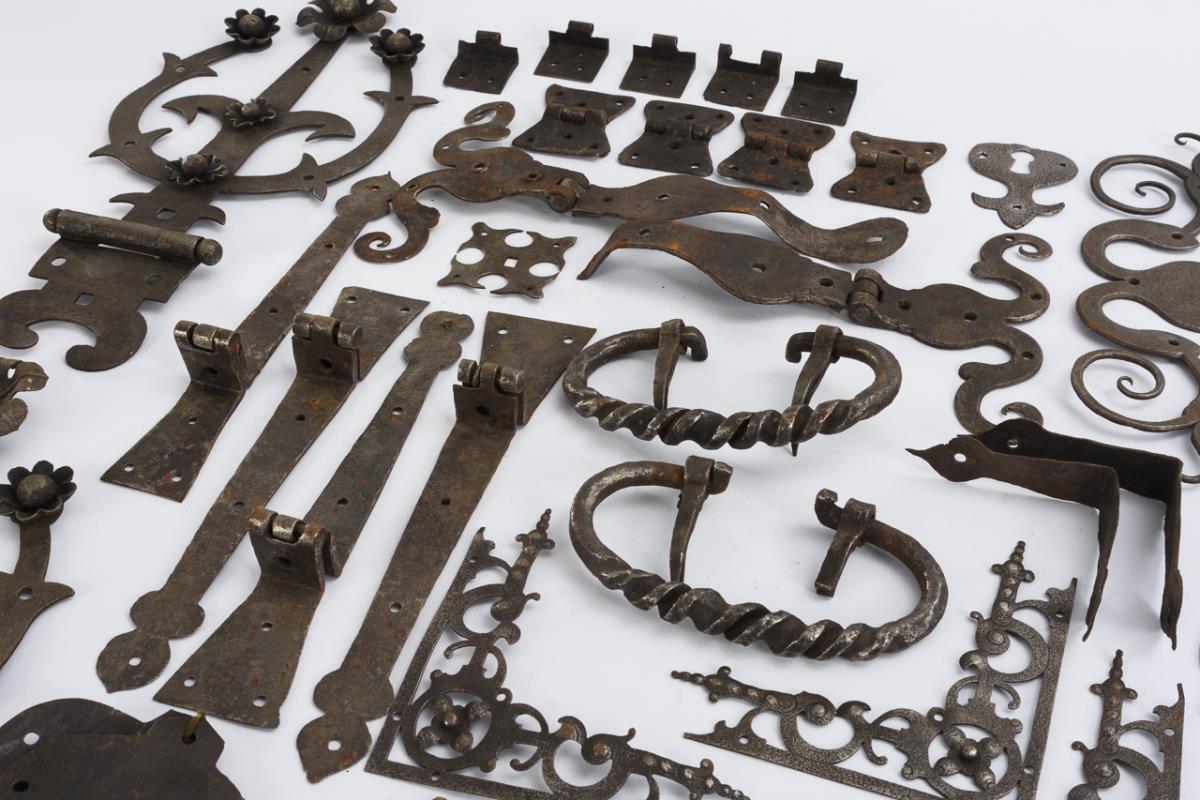 21 verschiedene Schlüssellochblenden, davon 7 aus Messing und 14 aus Eisen (1x mit Grotesken). 6 Paar Türbänder (teils für Schranktüren). 1 Paar tordierte Truhengriffe mit Splintnägeln. 4 gleiche "Schmetterlings"-Scharniere, 4 Scharnierteile. 7 Beschläge, davon 3 bzw. 2 gleich sowie 1x aus Gusseisen, Leichte "Kaminsäge" mit Messingknäufen. Alters-/Gebrauchsspuren, 1x kleinere Fehlstelle.