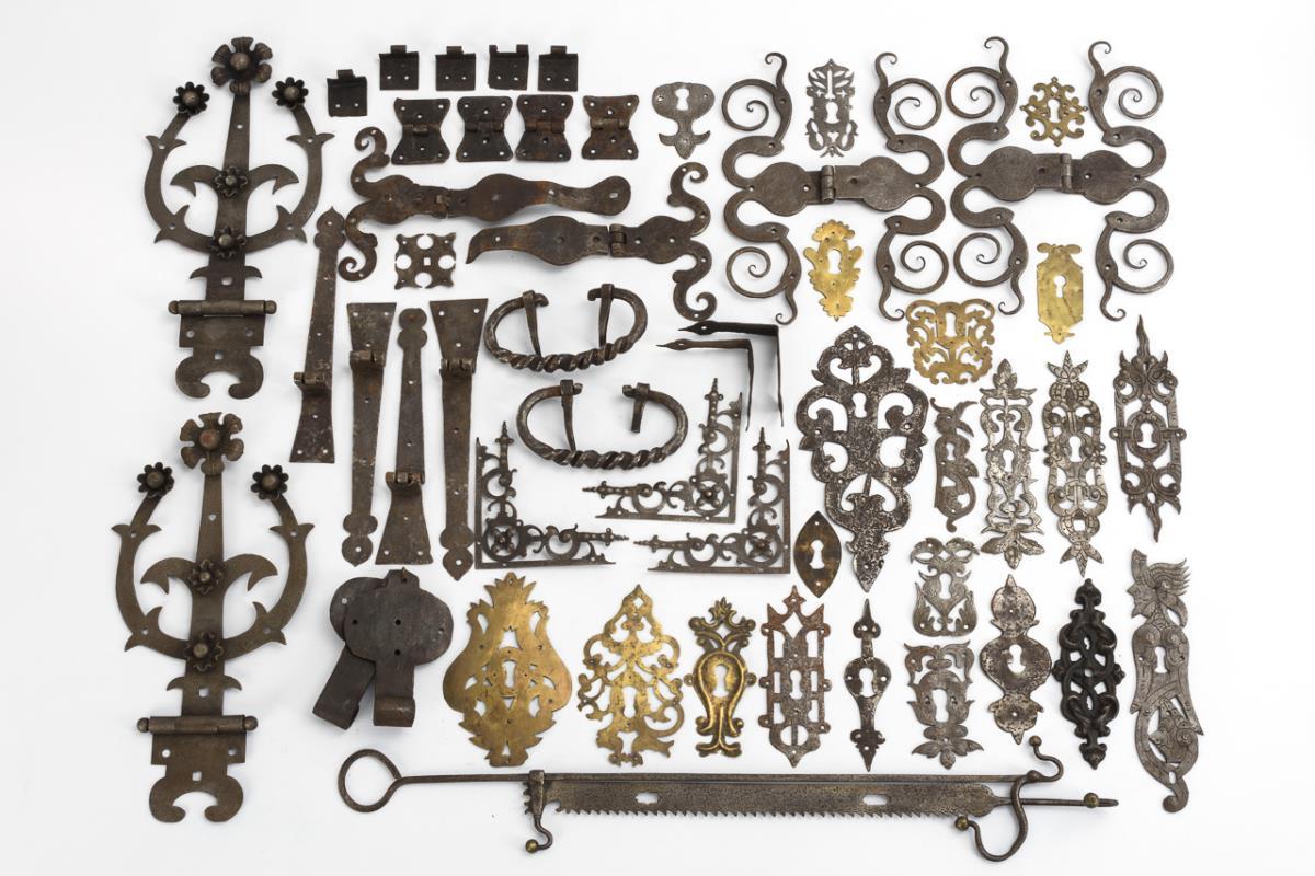 21 verschiedene Schlüssellochblenden, davon 7 aus Messing und 14 aus Eisen (1x mit Grotesken). 6 Paar Türbänder (teils für Schranktüren). 1 Paar tordierte Truhengriffe mit Splintnägeln. 4 gleiche "Schmetterlings"-Scharniere, 4 Scharnierteile. 7 Beschläge, davon 3 bzw. 2 gleich sowie 1x aus Gusseisen, Leichte "Kaminsäge" mit Messingknäufen. Alters-/Gebrauchsspuren, 1x kleinere Fehlstelle.