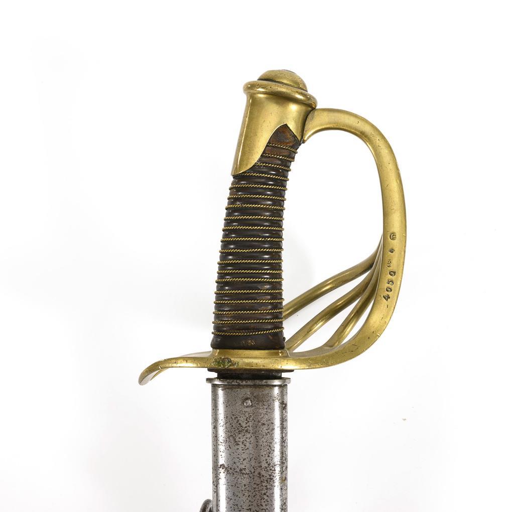 Gerade, einschneidige Klinge mit Spitze in der Mittellinie. Beidseitig mit zwei Hohlkehlen, auf Klingenrücken Reste der Beschriftung. Vierspangiges Messinggefäß, Ledergriff und Messingdrahtwicklung. Punzen auf Griff und Klinge kaum lesbar. Griffnummerierung: "4050". Metallscheide mit zwei Ringen.