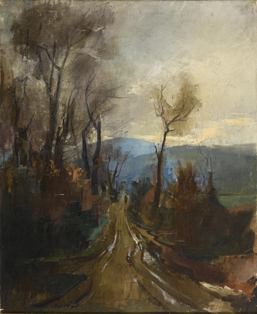 Straße mit Spurrillen zwischen herbstlichen Bäumen unter bedecktem Himmel.