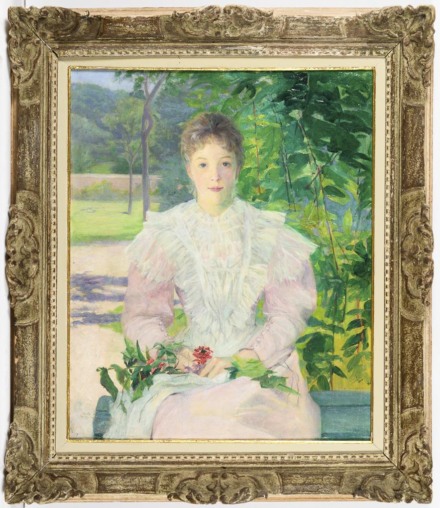 Frontales Bildnis einer jungen Dame im rosafarbenen Kleid im Schatten einer Pflanze im Garten. Nadellöcher in den Ecken.