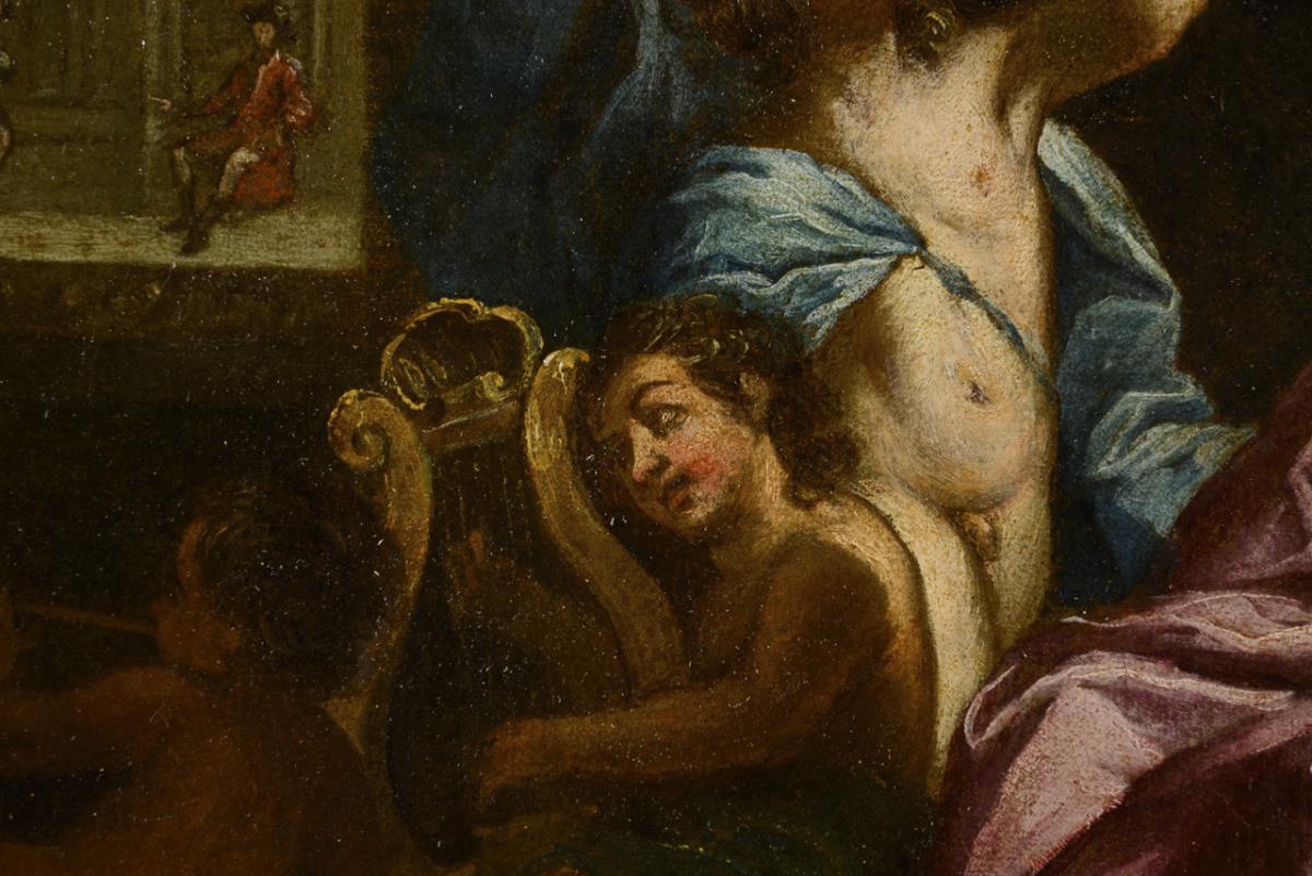 Junge Frau in antikisierendem Gewand entspannt an einem Tisch und umgeben von muszierenden Kindern vor einem Gemälde sitzend. Leinwand doubliert.