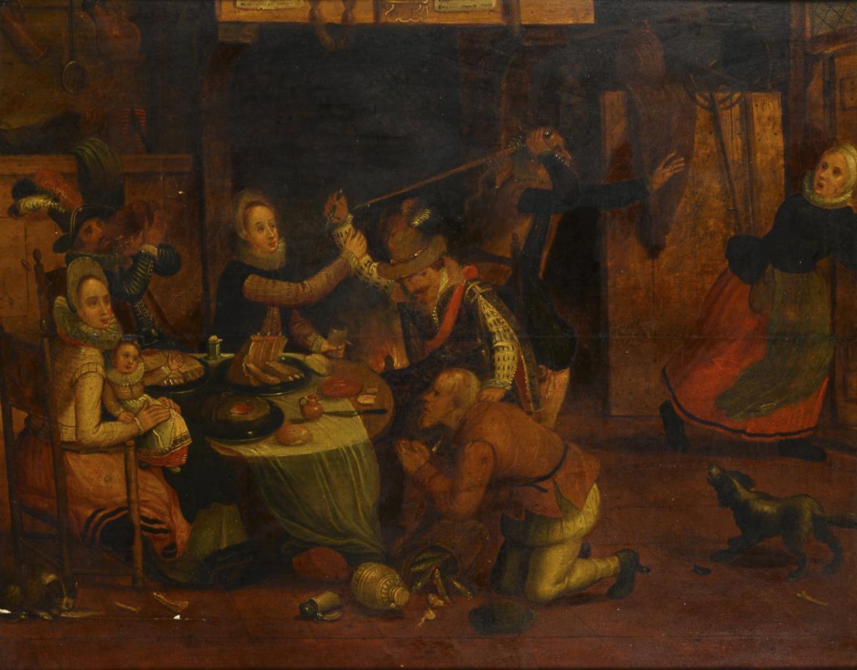 Drei saufende, pöbelnde und die Familie bedrohende Landsknechte in einer Stube an einem reich gedeckten Tisch. Altrestauriert.