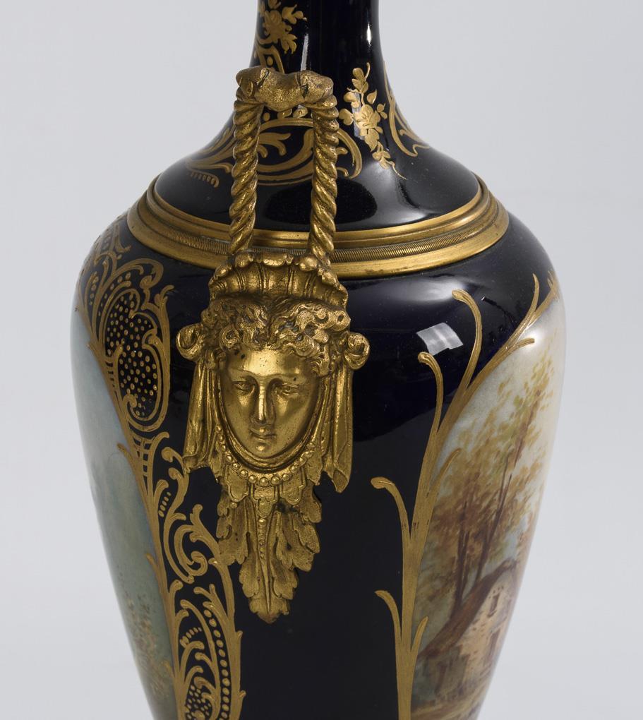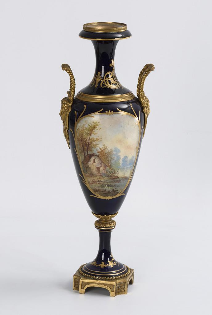 Schlank-ovoider Korpus mit zwei Bronze-Maskaronhandhaben, konkavem Hals und Rundfuß, auf Bronzesockel. Kobaltblauer Fond mit reicher ornamentaler Reliefgoldmalerei, beidseitig ein Ovalmedaillon, darin schauseitig eine Watteau-Szene und verso Landschaftsmalerei.