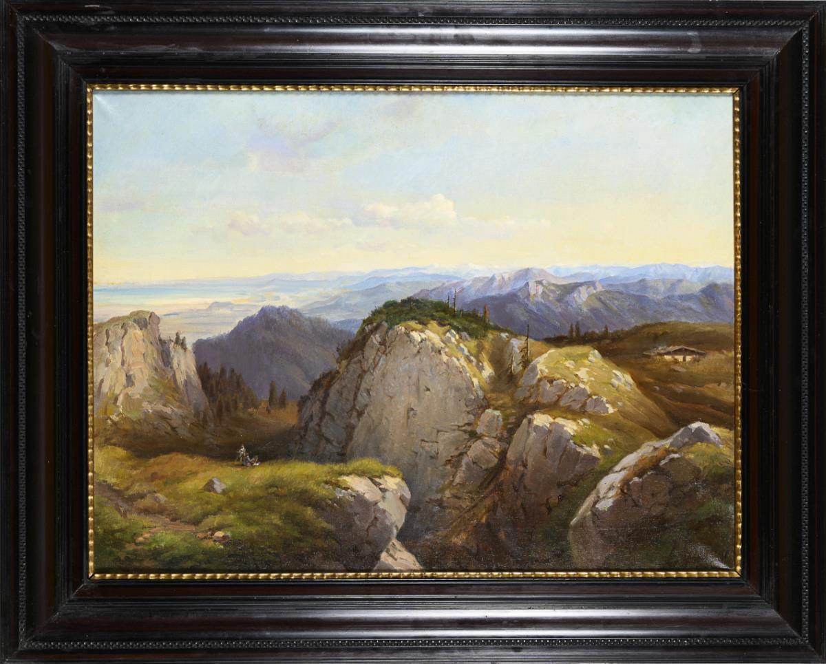 Freilichtmaler an einer Schlucht mit Blick über die Felsen und Gipfel an einem sonnigen Tag. Wenige Retuschen im Himmel.