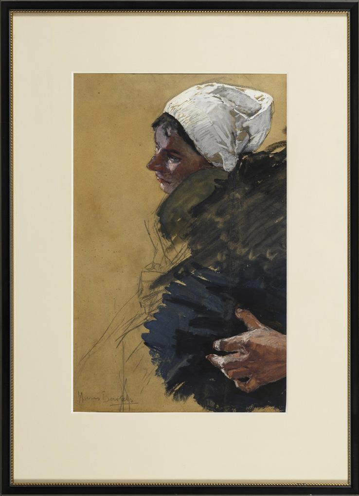 Profilbildnis einer jungen Frau mit weißer Kopfbedeckung. Mittelfalz.