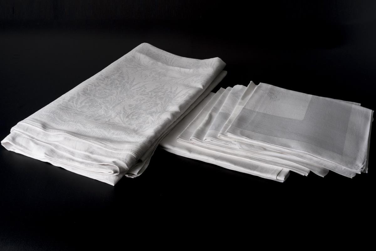 Weißer Leinendamast. 350 x 200 cm bzw. 81 x 81 cm.