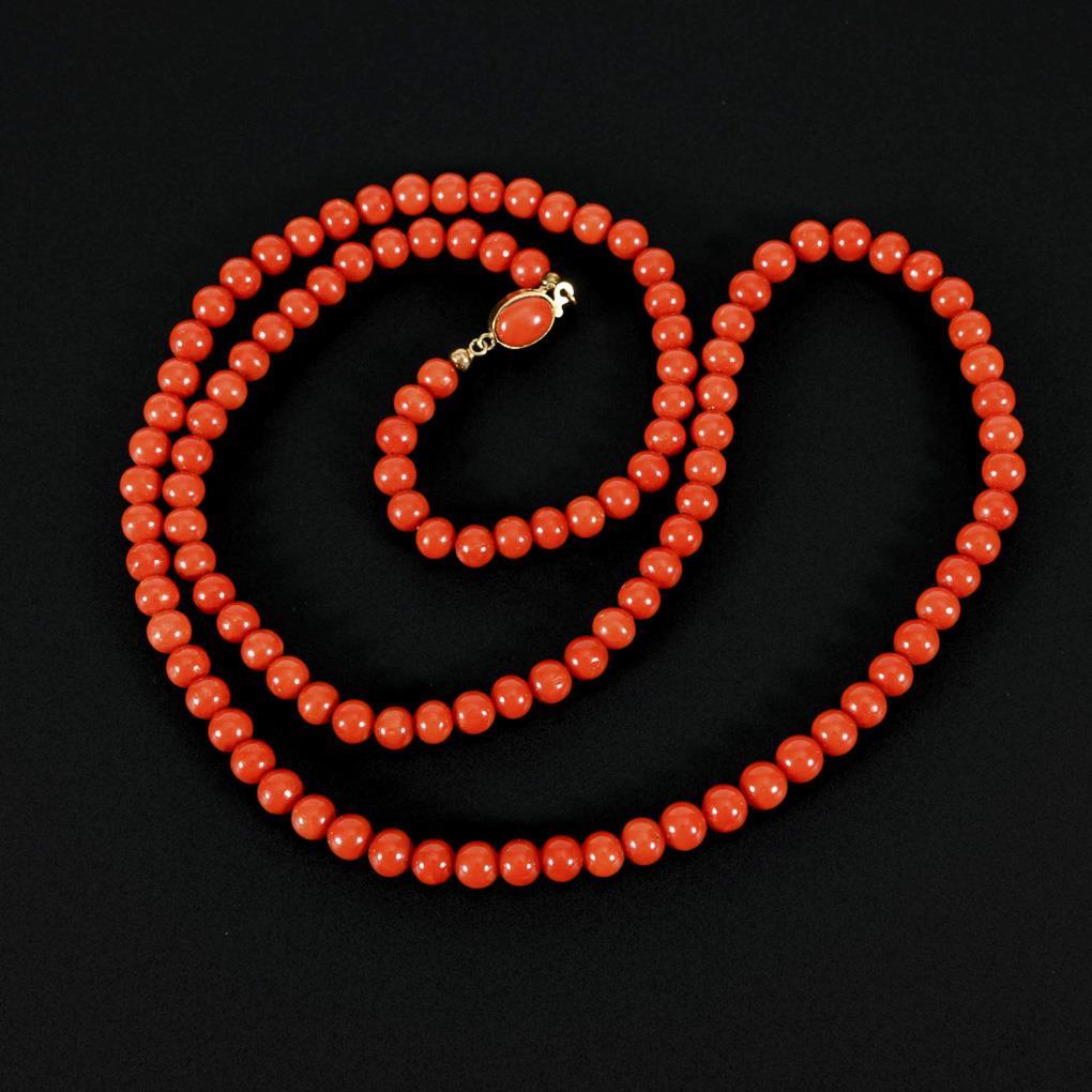 Schnürkette mit Korallenkugeln, an Zierschließe mit 2 zargengefassten Korallencabochons.