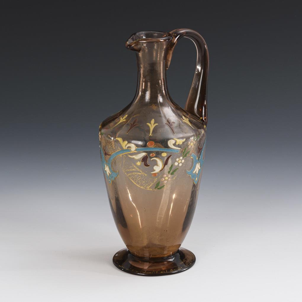 Konischer, längsoptisch formgeblasener Korpus mit Enghals, Henkel und Rundfuß. Mit ornamentaler Email- und Goldmalerei; ausgekugelter Abriss. Gold berieben, 2 Bestoßungen an der Schneppe.