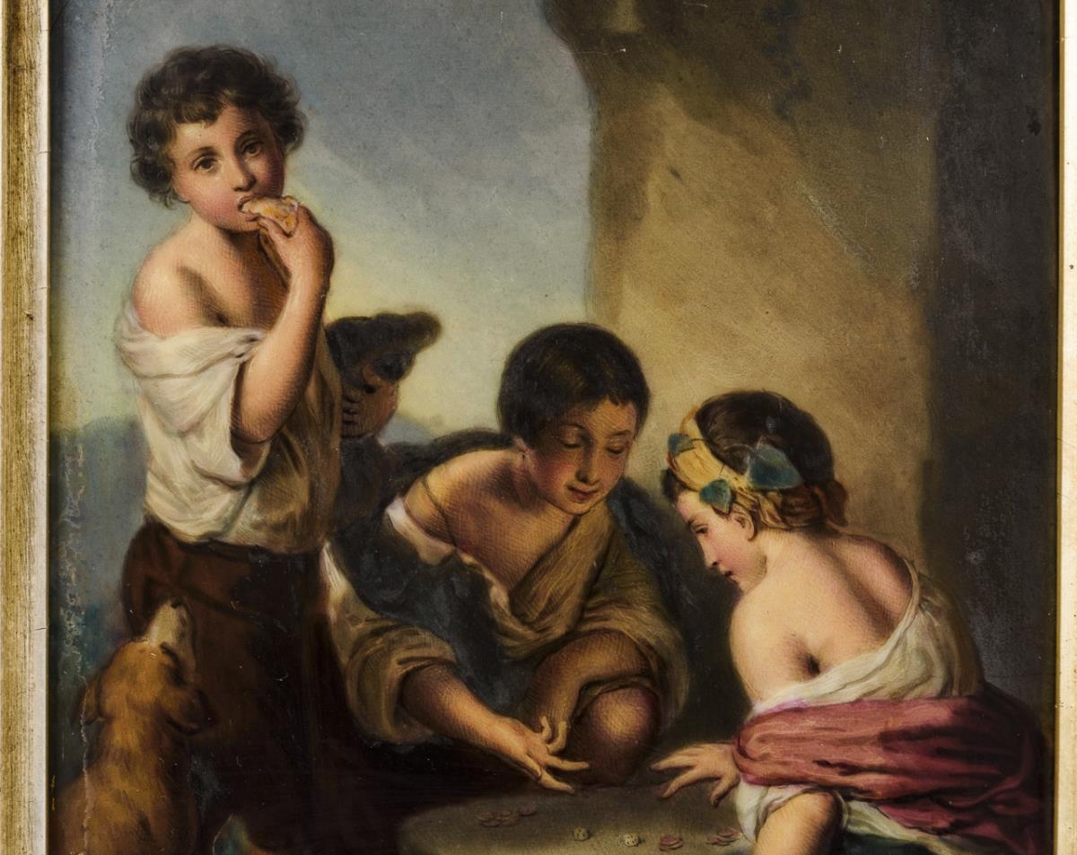 Porzellangemälde: Bettelknaben beim Würfelspiel.