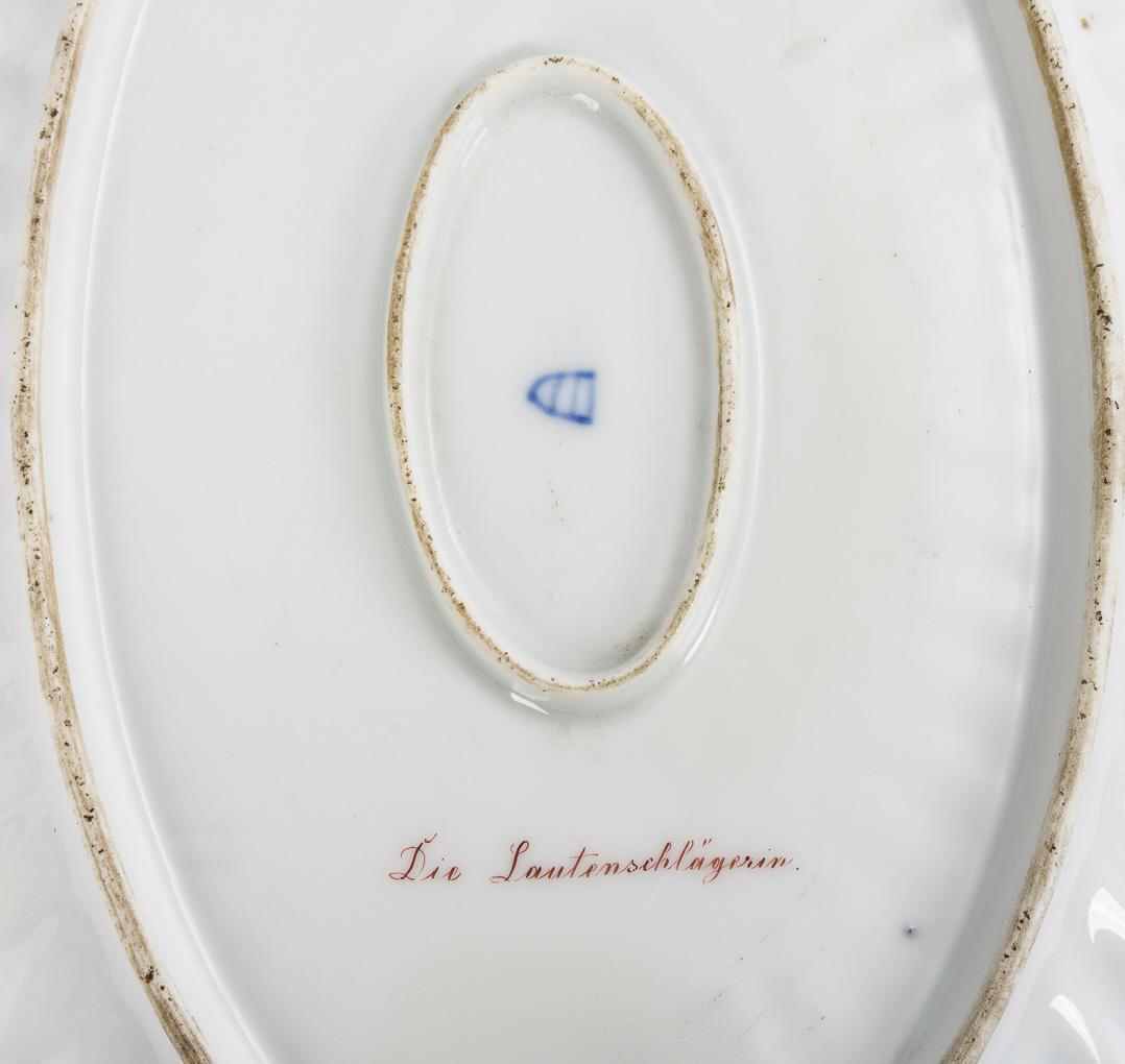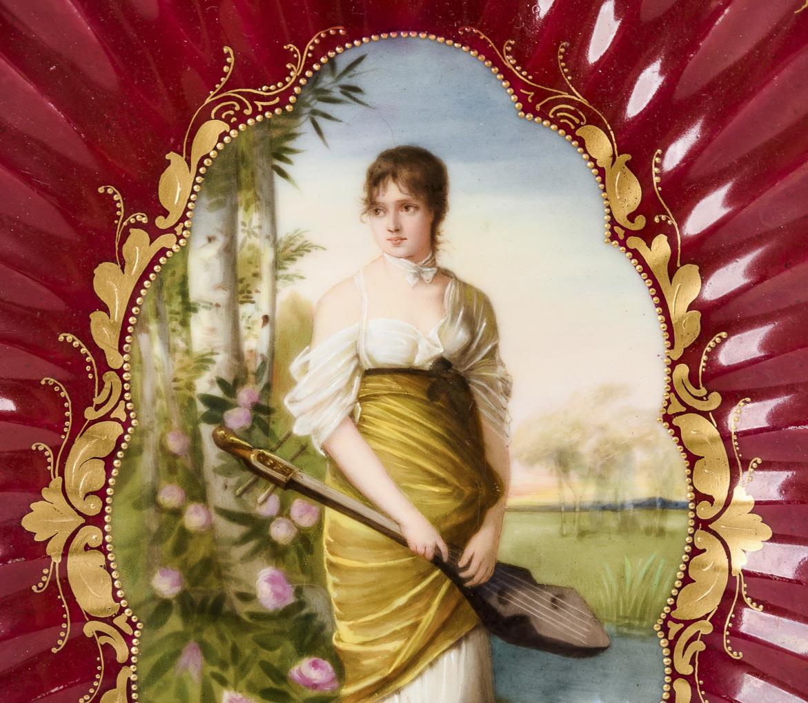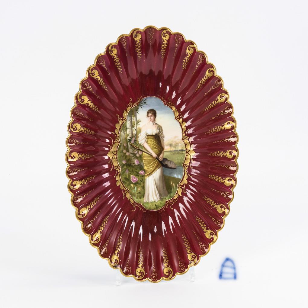 Ovale Schale mit gerippter Fahne. Bordeauxroter Fahnenfond mit floraler Goldmalerei, im Spiegel die Darstellung einer jungen Frau mit Saiteninstrument, nach einem Gemälde von Friedrich August von Kaulbach (zugeschrieben; 1850-1920). Restaurierung am Standring.