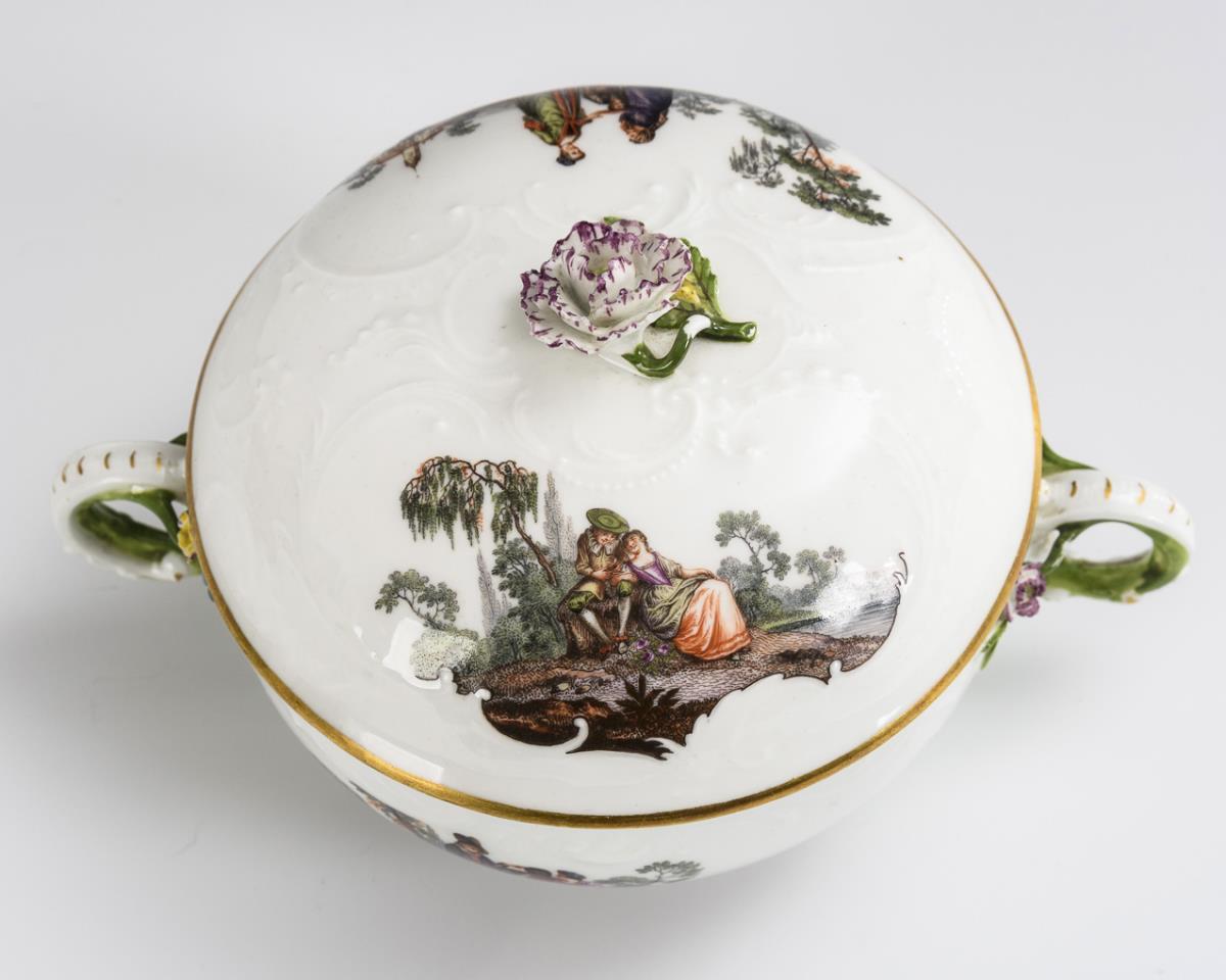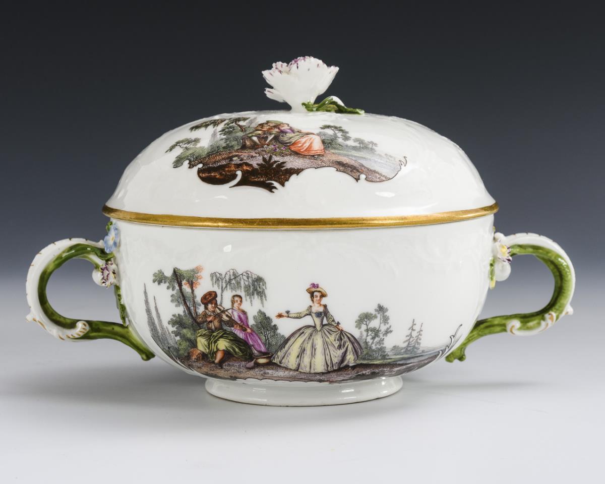 Kleine Terrine mit Rocaillerelief, Rocaillehenkeln mit Blütenbelag, Blütenknaufdeckel und Unterteller. Mit verschiedenen Watteau-Szenen, u.a. mit Wahrsagerin, Tänzerin und Harlekin. Gold teils berieben, Blütenknauf minimal bestoßen.