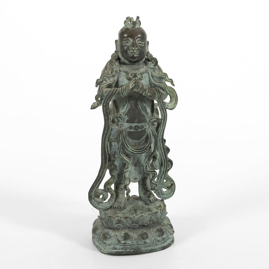 Auf doppeltem Lotosthron stehende Figur mit aneinandergelegten Händen. Durch Bänder und "wehende" Rockschöße dynamische Wirkung. Ein geschwungenes Band am rechten Arm fehlt.