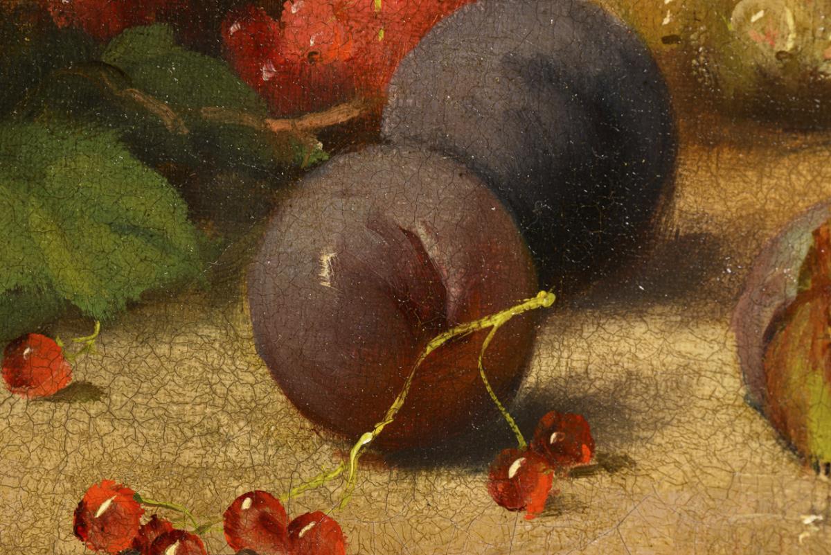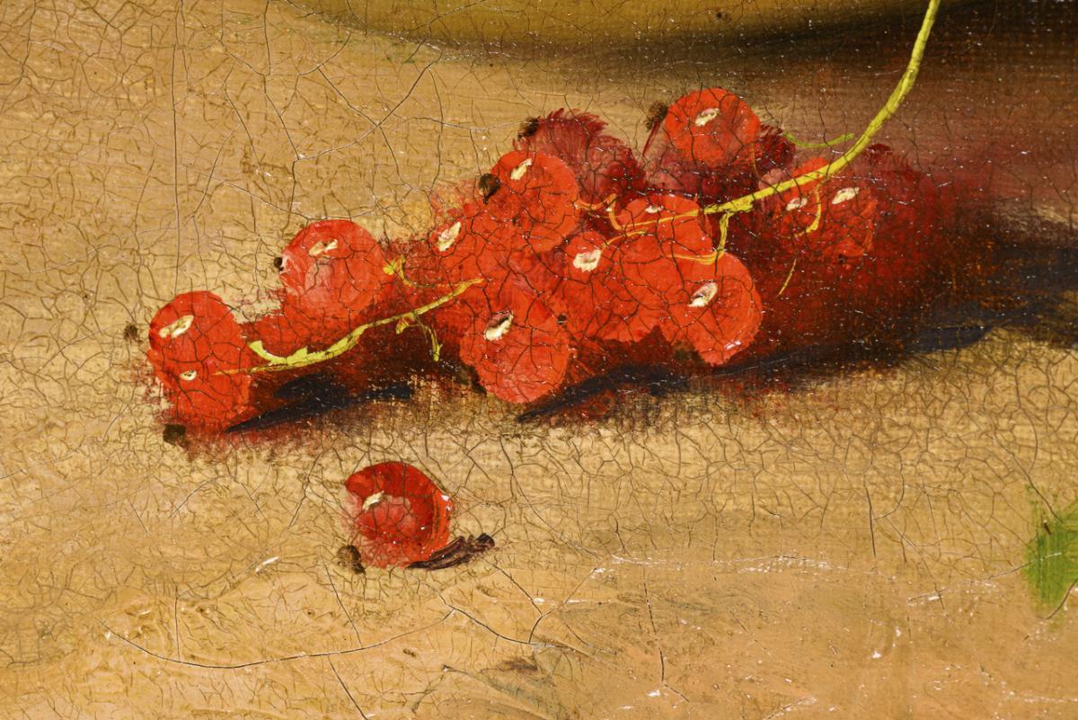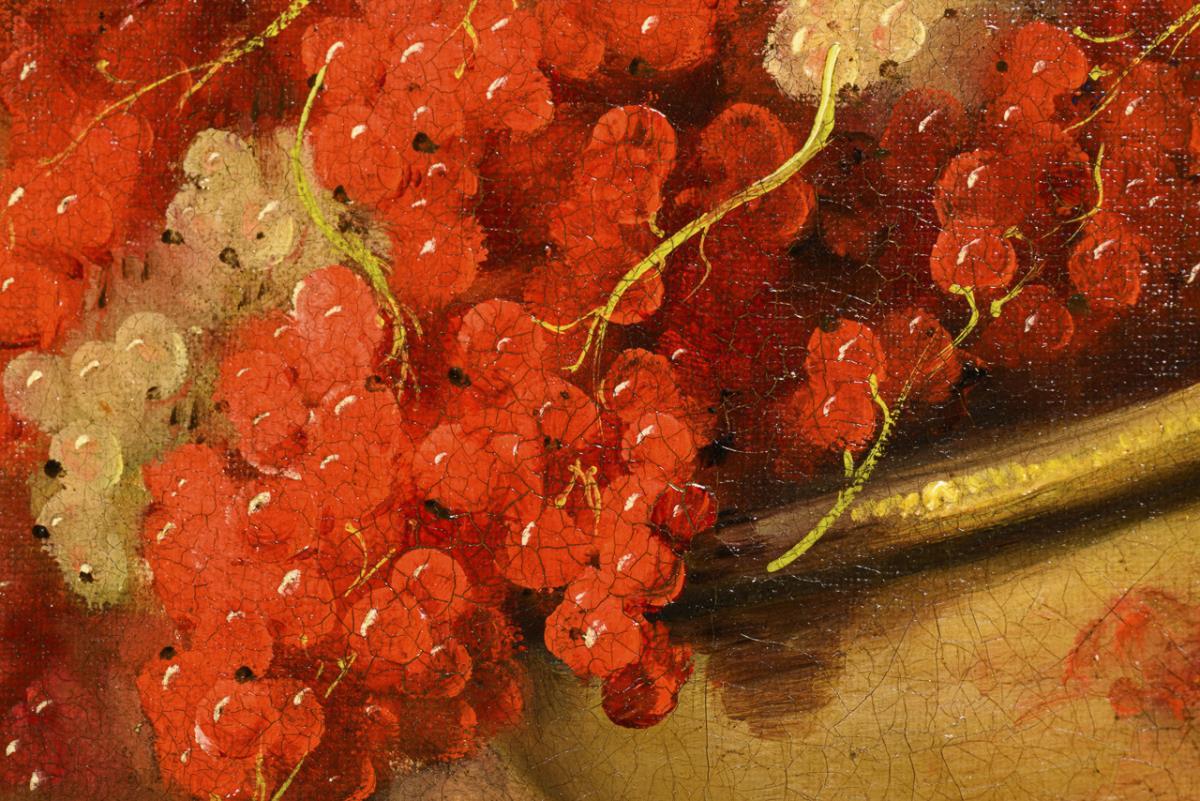 Pflaumen neben Johannisbeeren in Messingschüssel im hellen Licht. Altersspuren.