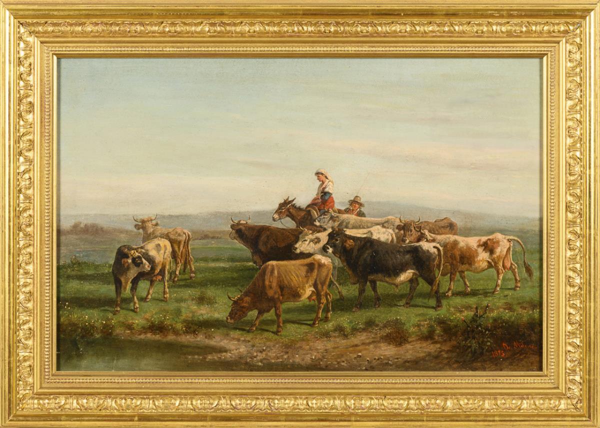 Bauernpaar mit Pferd und einer Herde mit Rindern im hellen Licht nahe einem Seeufer. Leinwand doubliert, im Himmel retuschiert.