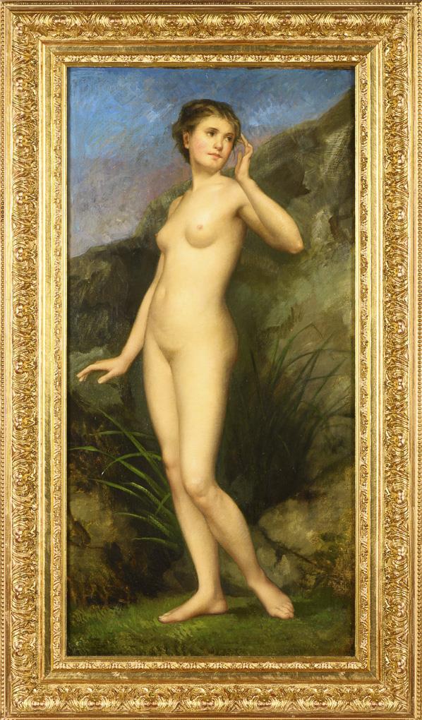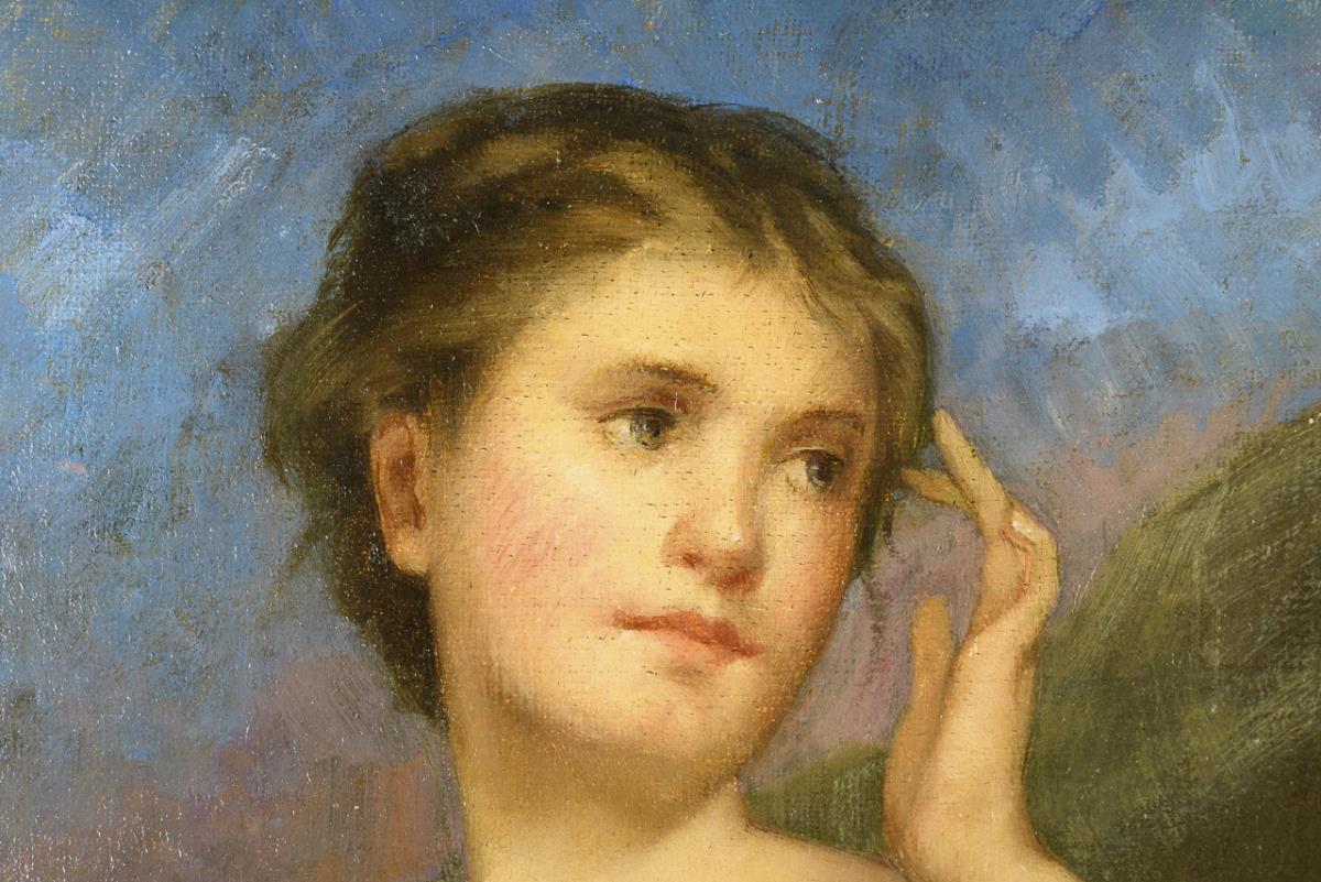 Junge Frau mit koloristisch fein nuanciertem Inkarnat in felsiger Landschaft unter blauem Himmel. Eine kleine restaurierte Stelle.