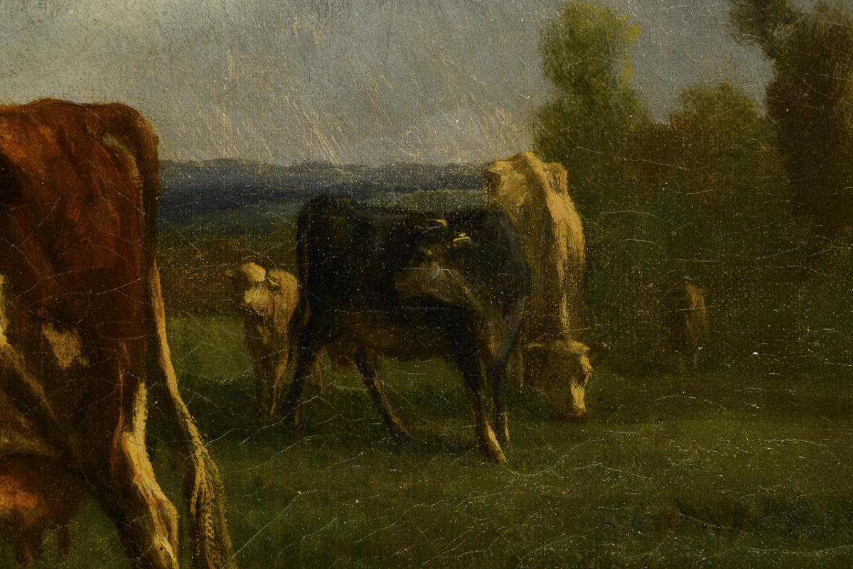 Kühe und Schafe nahe der Hirtin auf der grünen Wiese im Sonnenschein. Zwei kleine restaurierte Stellen mit Hinterklebung.