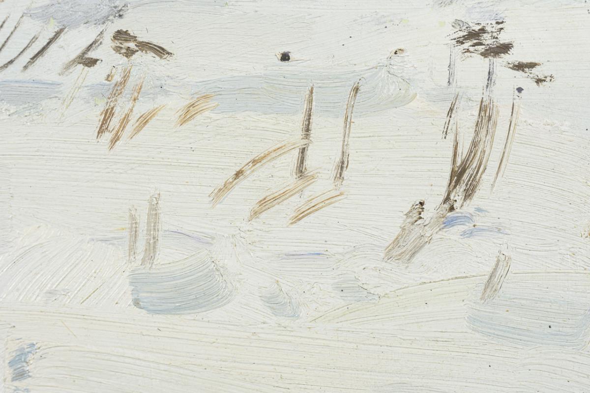 Der Maler mit Staffelei im Schnee nahe den Dorfhäusern. Minimale Altersspuren.