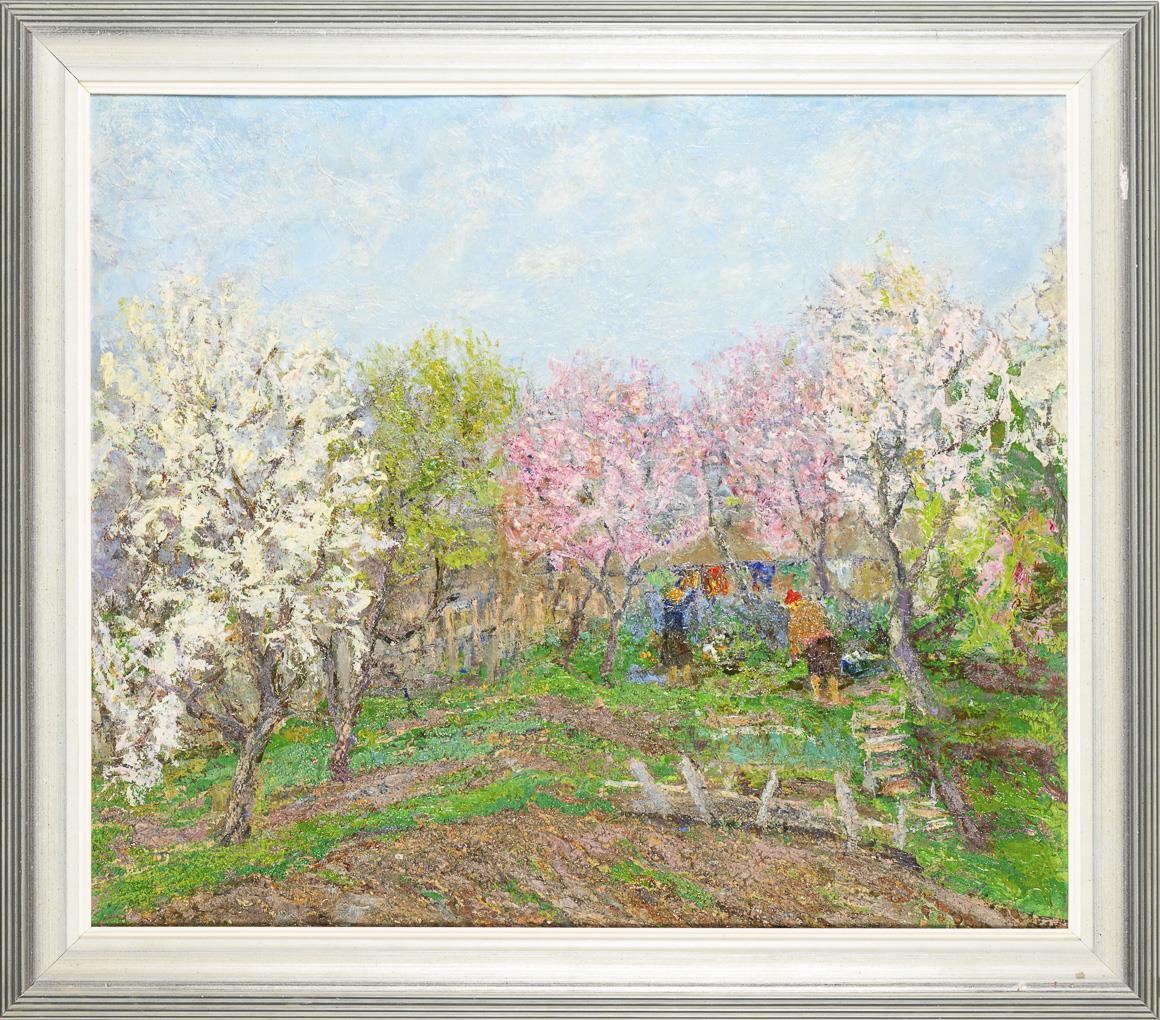 Blühender Obstgarten mit Beeten und Bäumen unter blauem Himmel. Minimale Altersspuren.