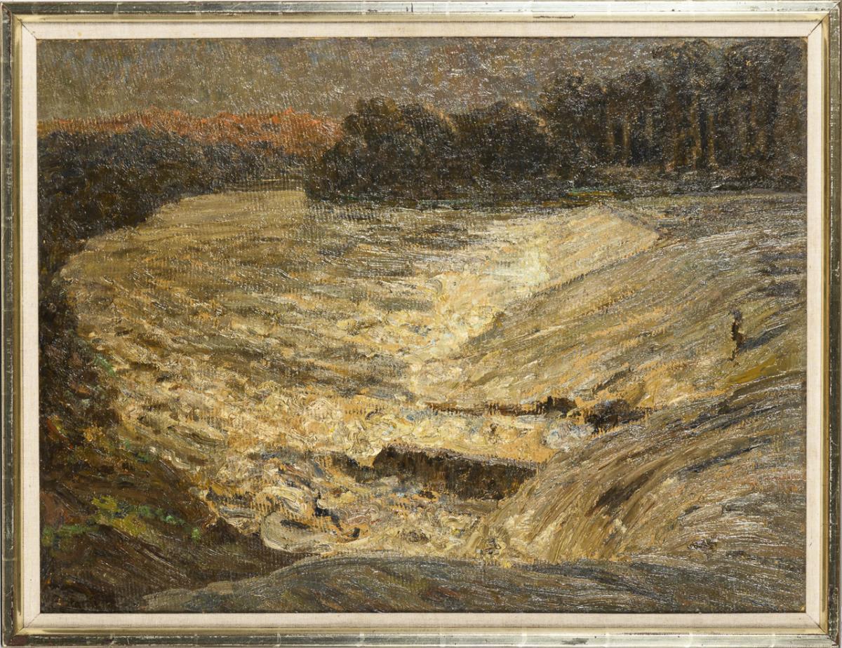 Breiter Flusslauf zwischen angrenzenden Wäldern am Abend bei niedrig stehender Sonne. Leichte Altersspuren.